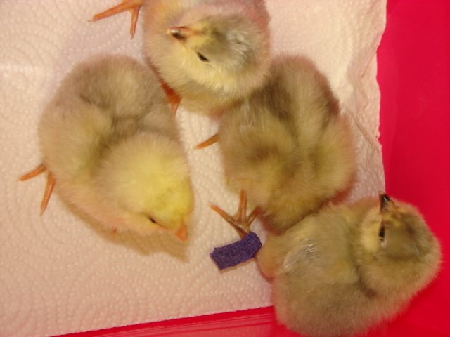 Donna this is where I need your help... My biggest issue was that my hatcher dividers fell down (thanks, chicks!) and everything got mixed up. I had 7 Lav Am eggs hatch, one had weird feet so it got culled and one was 100% a black split. I am thinking I have 2 splits, 3 lav and 1 white but I am not sure about the bottom right. It MAY be an Orp but has Lav feathering coming in.