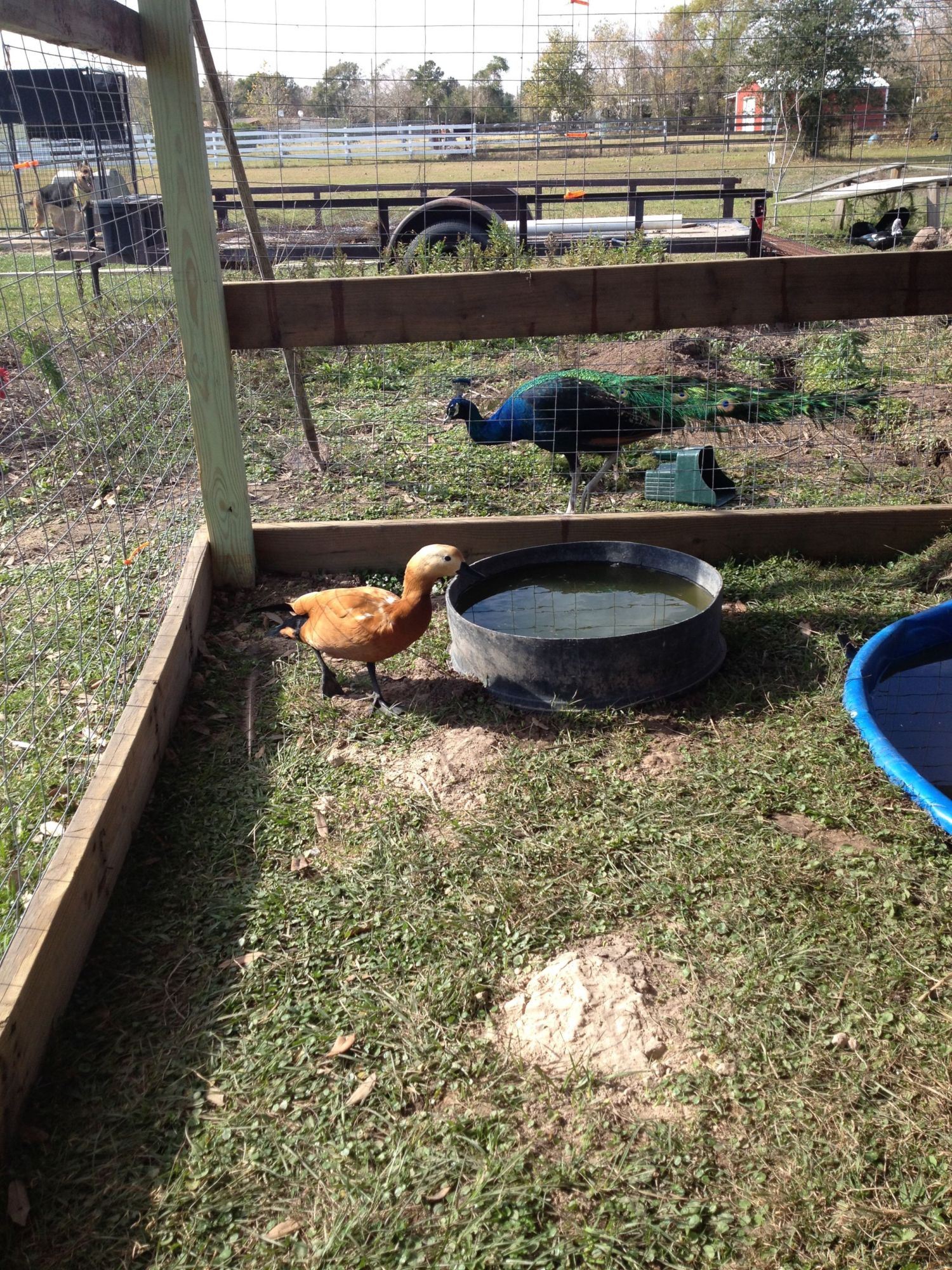 this is my new pair of ruddy shelducks! they are in a 20x15 pen thats about 6 feet tall i have a buried barrel for them that is not in this pic and i also dug a hole for the pool burying the pool was one of the smartest things i could have done at the bottom of the pool is a hole with a water hose going about 6 feet out underground leading into a trench that gos directly into my pond. sadly the female was shot by duck hunters about two days after i bought her
