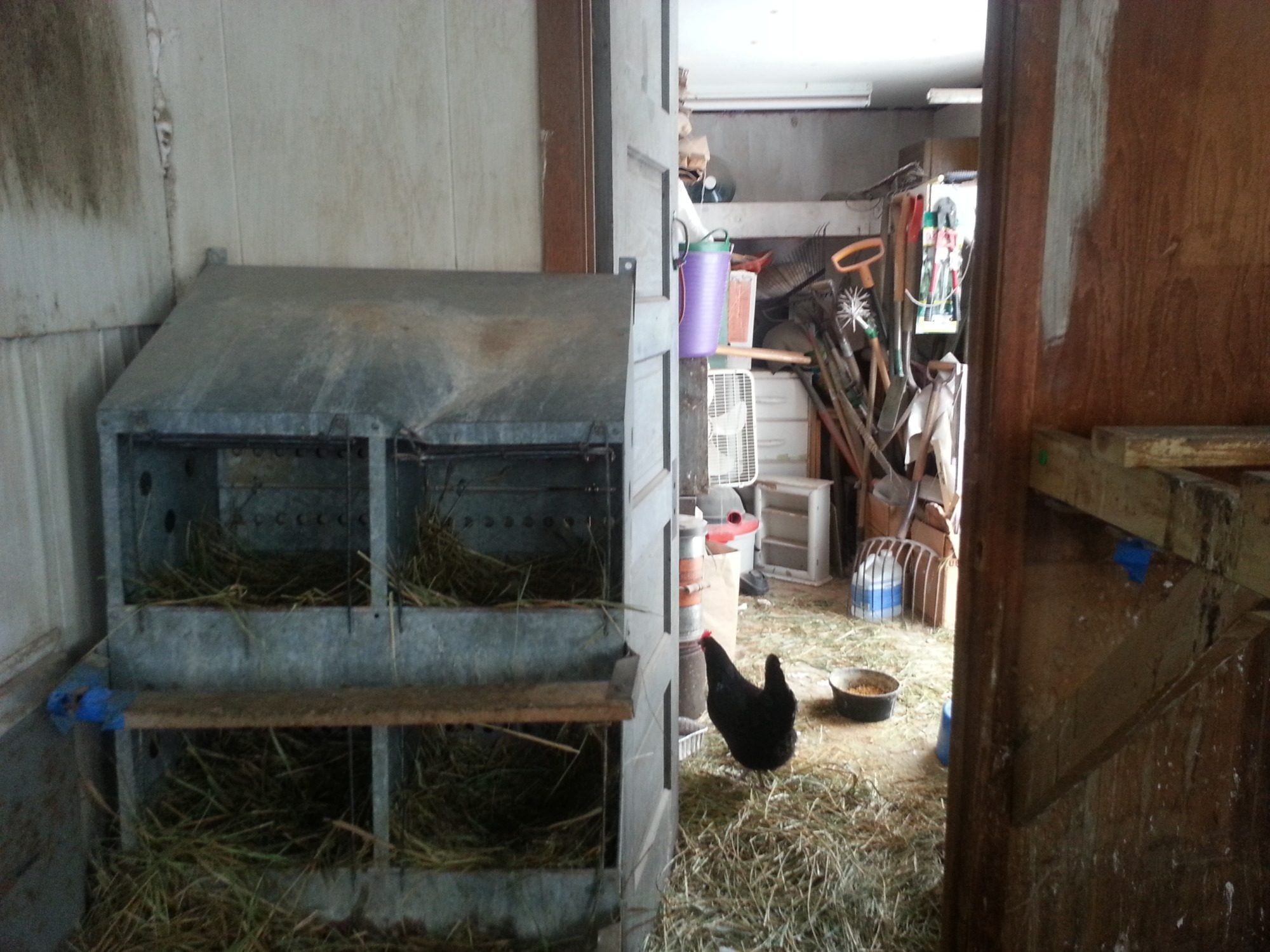 you can see the same roosts to the left in this pic. old steel nestboxes on the right. doorway into storage portion of the trailer. yup, it is a mess.