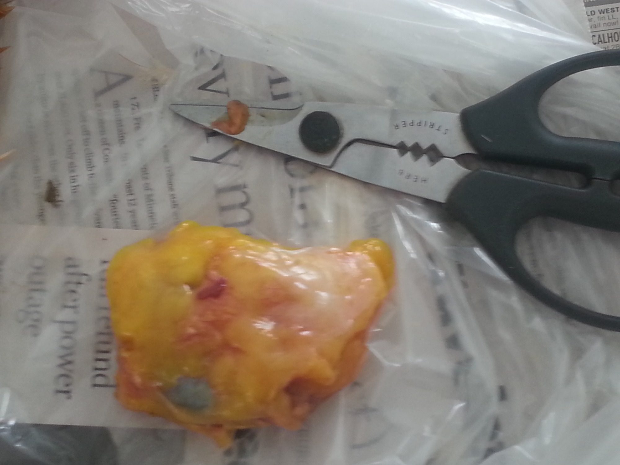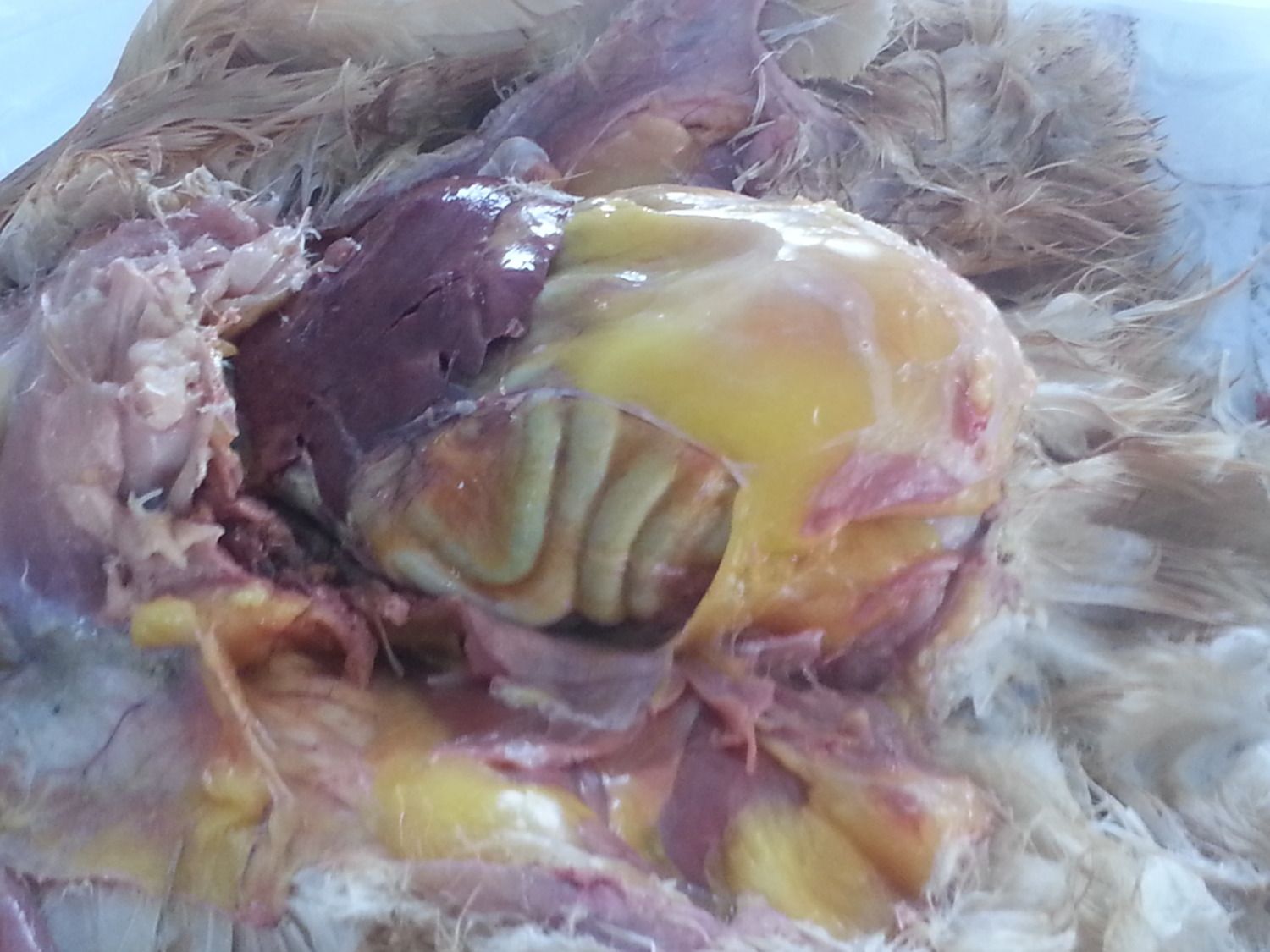 I thought it was to yellow too, but didn't post it b/c color on the computer screen from a photo can be so wrong. The egg yolk is all fat so if it were broken egg yolk in her abd it would have a fatty feel to it. Again no expert here, but w/ her age and the look of the abundant yellow stuff free in her abd cavity I would suspect more of an egg laying problem, one or more broke and were in her abd setting up infection which would lead to sepsis, and she would feel bad so not interested in eating.