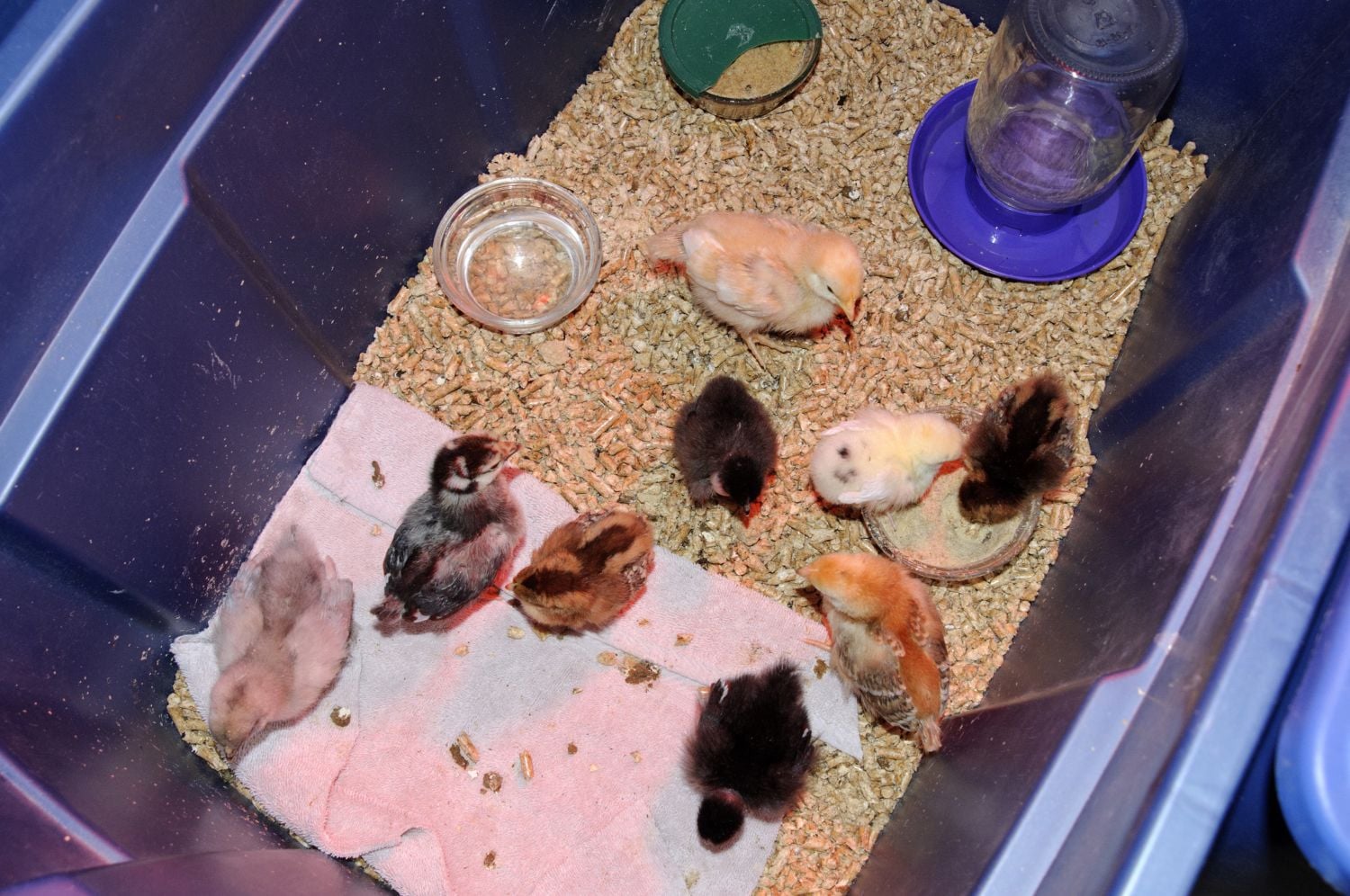I would definitely stick with plastic. Here's an old pic for one of the things I did when the chicks were really little to try to keep them from being covered in it... anything with a lid that you don't mind cutting spaces out of - big enough for them to get feed but not enough for them all to stand in it. It's the one up top with the green lid. Once they got big, I just use a casserole dish/bowl. It's heavy so that they can't really tip it if they choose to stand on the edge, but they really don't get into their feed dishes anymore.