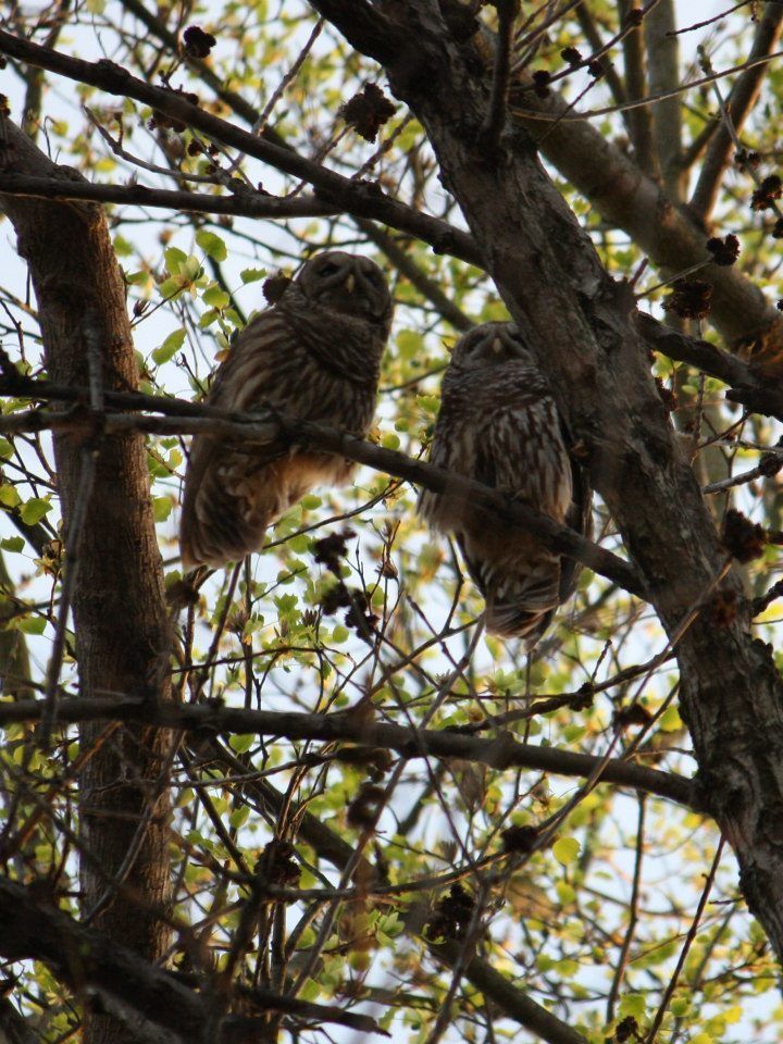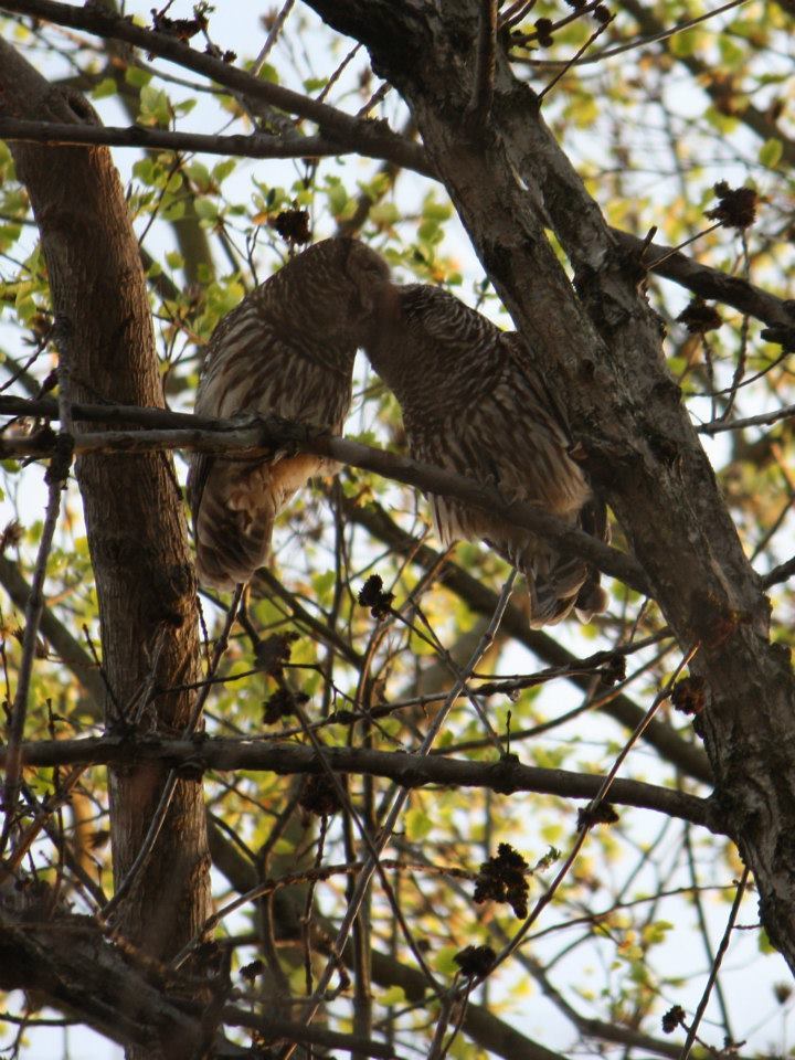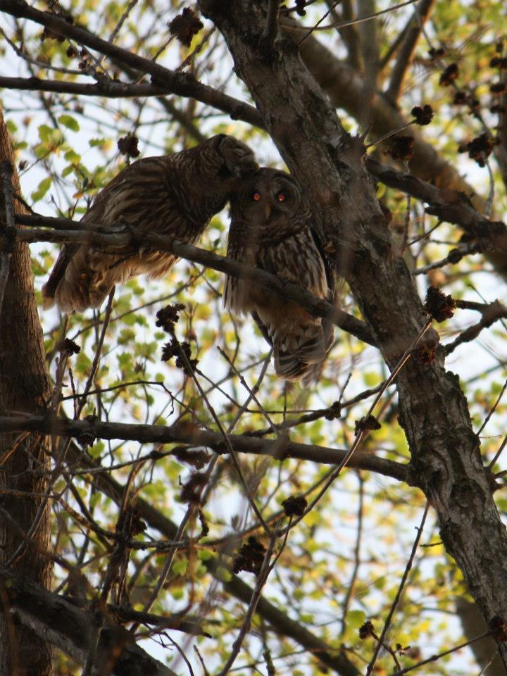 I have read about owls getting into the coop, sidling up to a hen on the roost and pulling it's head off.I have this romantic couple that likes to roost in a tree right above my coop and run and fly around the neighborhood. They appear to be very much in love with each other, I never knew owls kissed? (see pic)