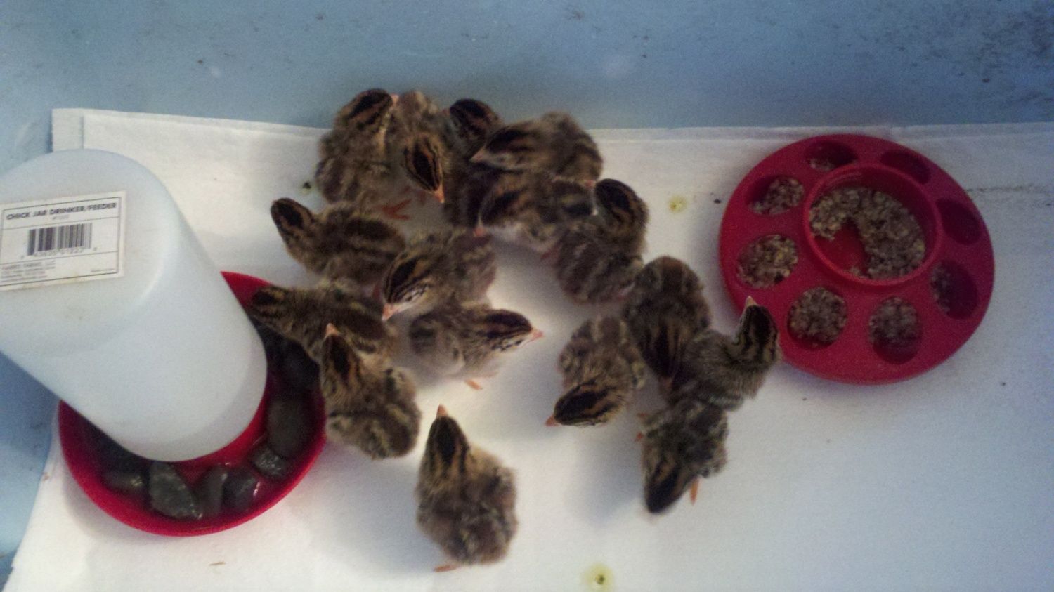 Guess what came in the mail today??? My sixteen guinea keets! They were all alive and well, cheeping agrievedly, and are drinking and pecking at the fermented food. Hoping we don't lose any from the shipping stress or user error