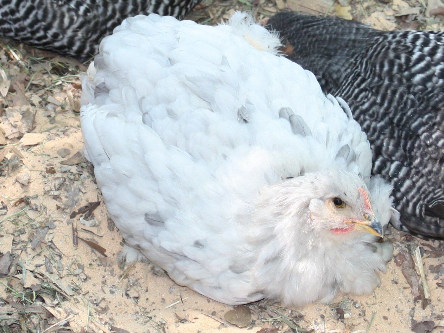 CountryGirl: Here are pics of our Blue Splash Cochin (Gizmo) and she is 13 weeks in the pictures, much smaller comb and wattles then your guy (I think you have a Blue Splash too?) and she is a wide round ball of fluff, really wide. She seems to want to mother our new chicks too. Although the new chicks want nothing to do with her.
