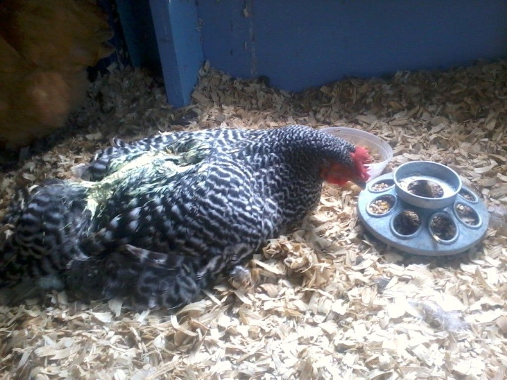 Big Mama, the BO stayed on the roost all night and she put herself up there last night. She is trying to eat, but it seems like she is having trouble seeing with just one eye open, plus she seems to not have full control of her tongue. While I was out there around noon I did get some wet food in her by putting it into the side of her mouth and my husband helped hold her while I gave her more. She did drink on her own, which is an improvement from when I had her inside. I did take her off the roost later in the morning, she was not happy with me and I kept following her around and putting a little wet food in her mouth and making her walk. I put her in the run and threw down some scratch and she went for it and I did see her get a piece of scratch or two and eat it. She also pecked at some wet food and meal worms at first and it was like she was doing the motions but not actually getting anything.