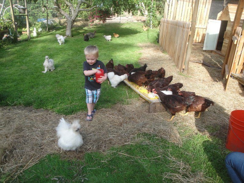 The three year old had those Silkies following him all over the place. All sixty birds except turkeys have the run of the barn yard in the orchard. Compost pile and shrubbery way in the back where they go forage, shade, and hide from hawks.
