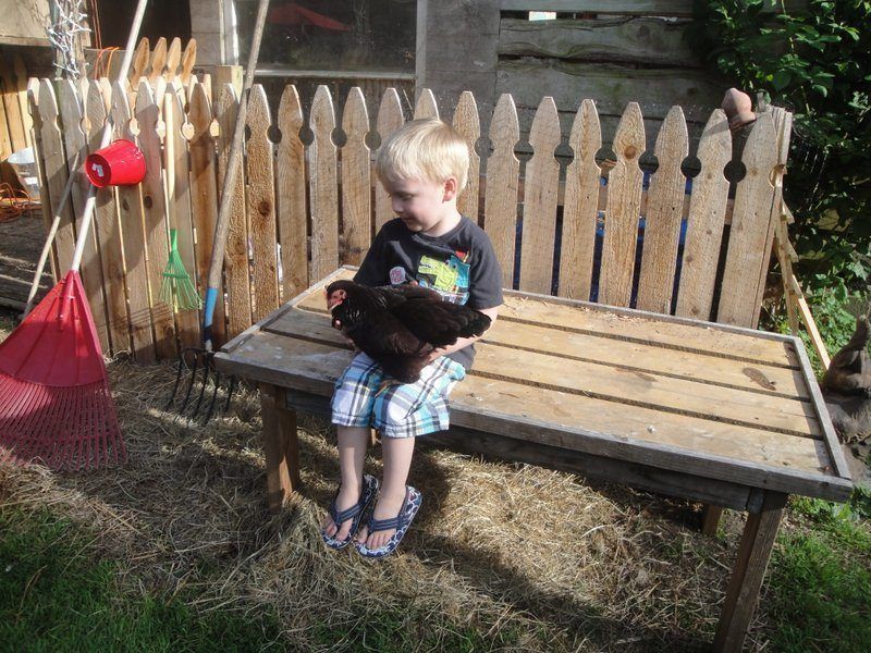 The sweetest, gentlest, most pettable birds in the yard are the bantam RIR pullets. They are laying and love to be loved on by people. Remember that Hello Kitty chick I used a bandaid with same name to straighten toes? Same little chick all grown up in my three year old Grandson's lap.