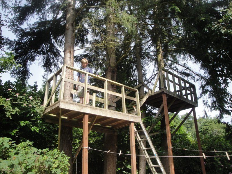 The boys like to pelt grown ups with fir cones from up there. A rope tied to a bucket lets them haul up supplies.