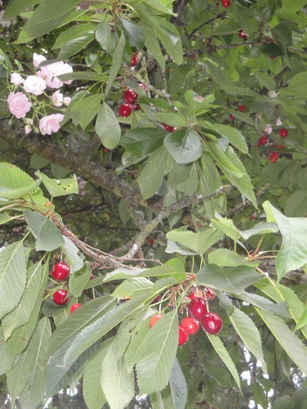 My Bing cherry tree is engulfed with rambling roses. More roses on the tree than cherries some years. I got up a ladder to pick a few pints this morning. The flock under the ladder gobbling dropped fruit. The wild birds eat them and drop a lot too. The chickens are under this tree during the hottest part of the day.