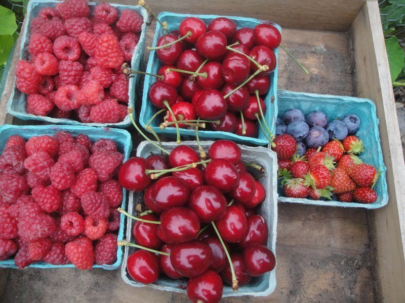 Bounty from the garden this morning. Strawberries are done and blueberries coming on. Peak cherry and raspberry time.