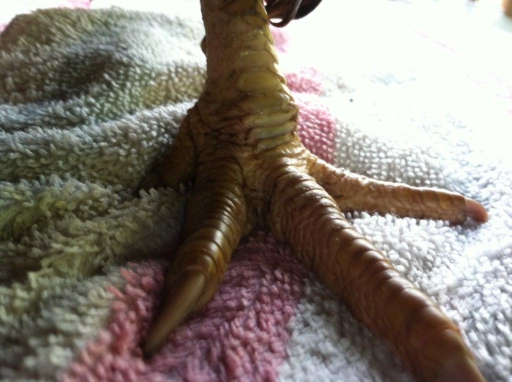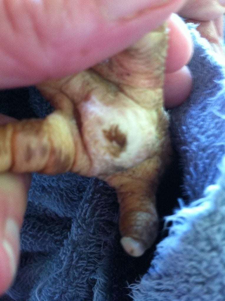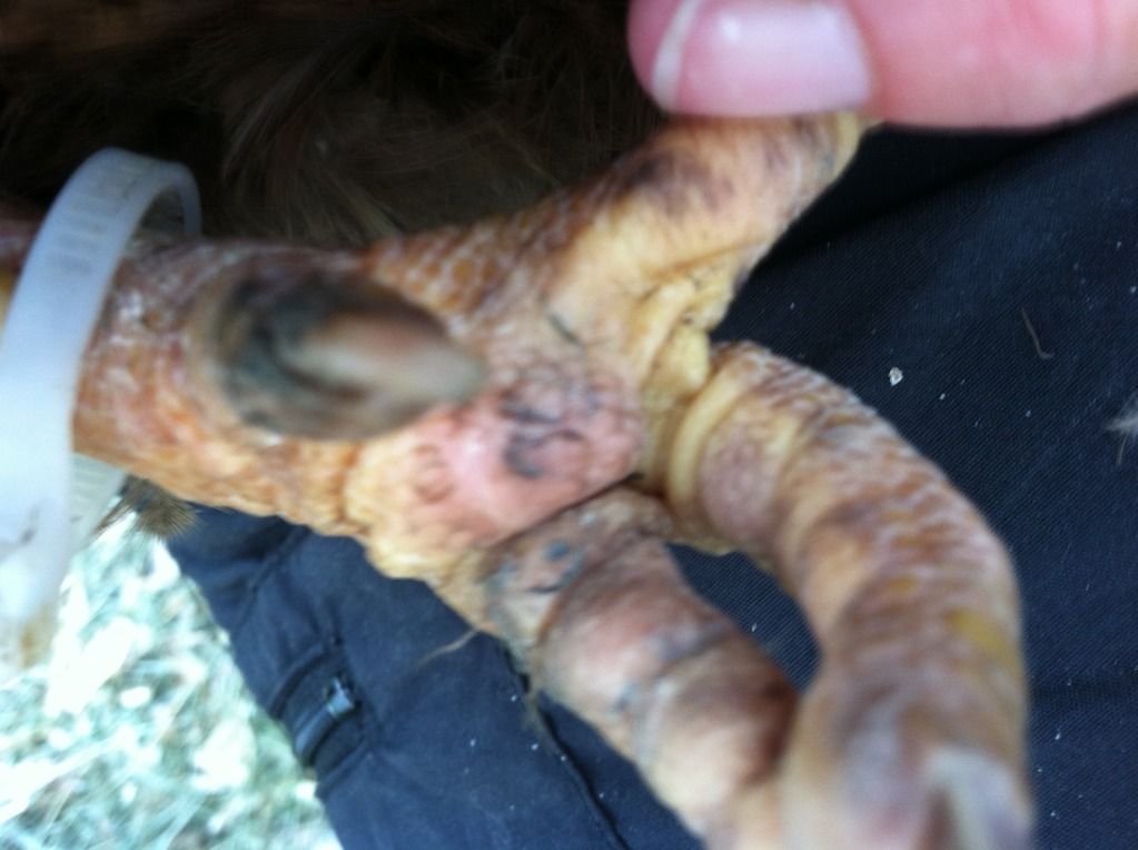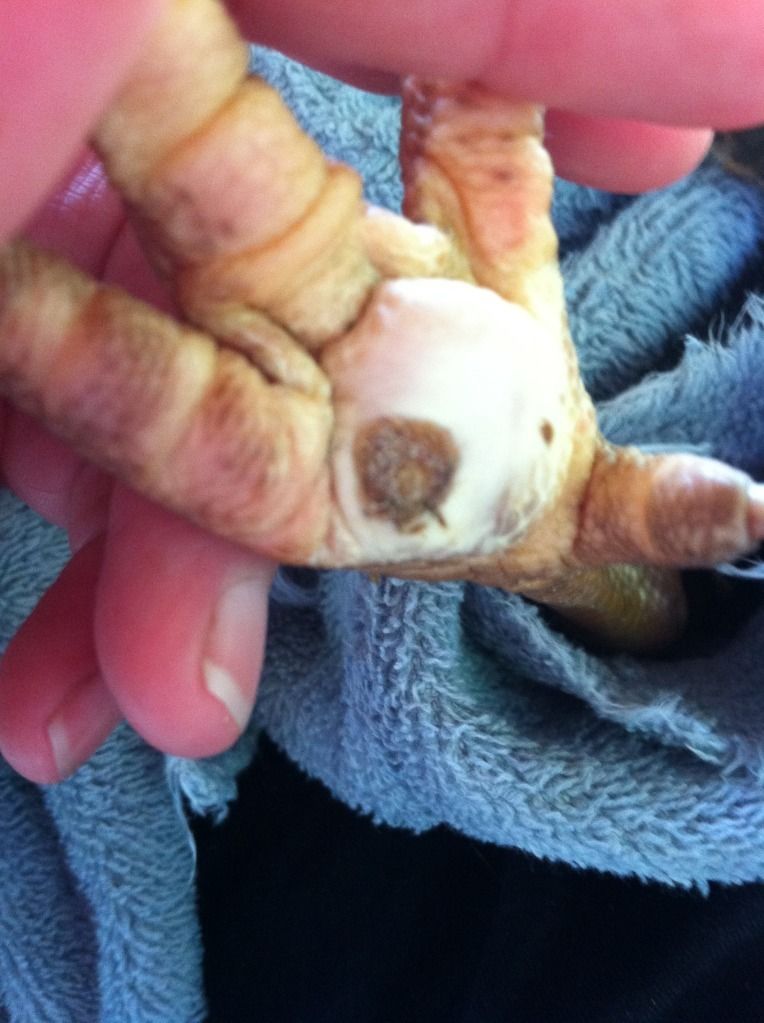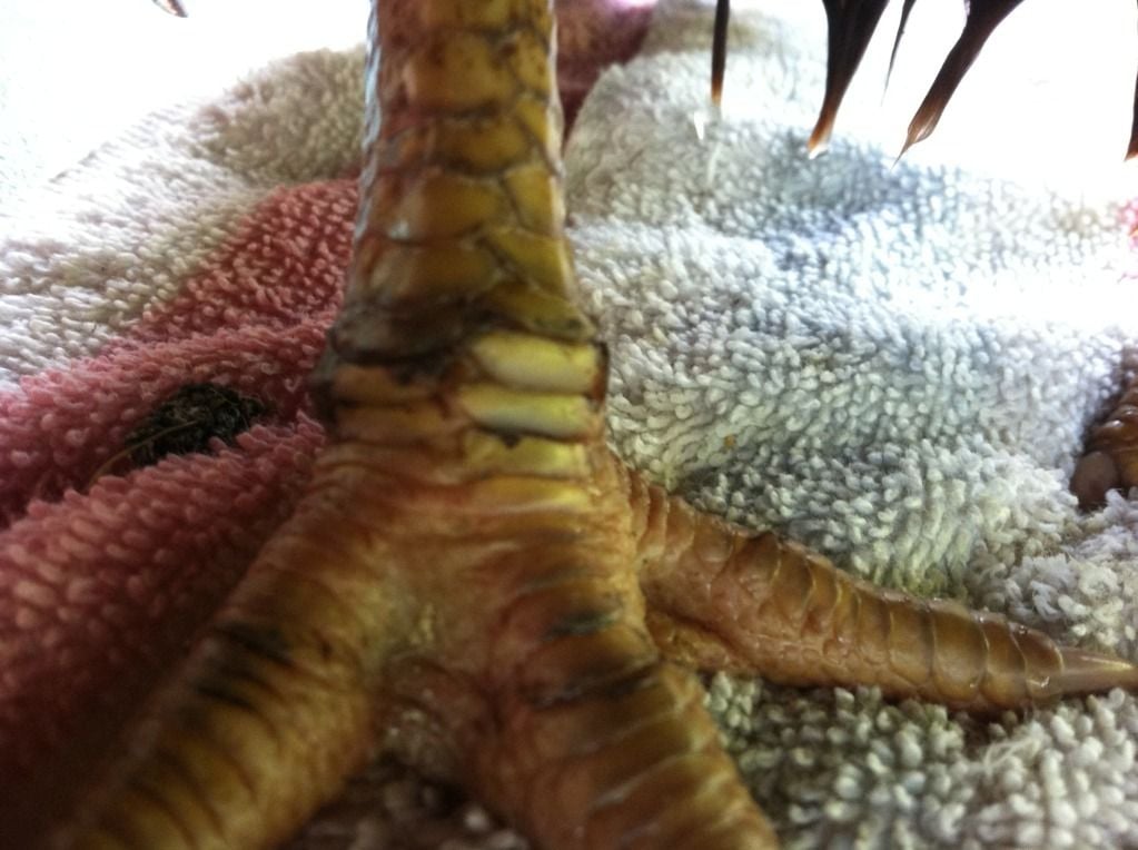 Her feet after taking the bandages off and soaking them. Her scales are raised. The bandages had been on since last Friday. I worked so much since then I honestly didnt have time to change them. I did wrap them with a little more wrap because I knew my schedule was busy. After soaking her legs I used a baby wipe and removed dirt from under the scales. They laid back down almost flat. It rained off and on since Friday so the dirt just worked its way up under the scales. Her feet themselves where the scabs are were clean though.