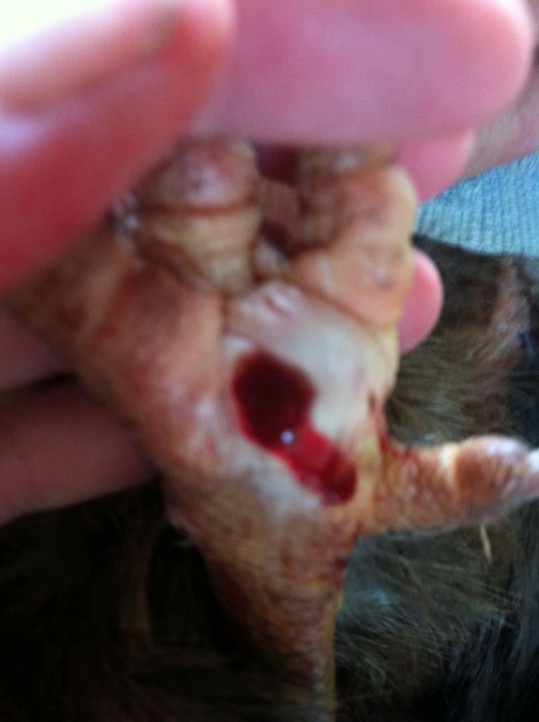Leahs Mom- THANK YOU for suggesting the biopsy punch. I used it today on Green and SO MUCH EASIER than an exacto knife. Cut right thru the scab easily. Lots more blood BUT I can honestly say I got some of the core out. FINALLY Her foot that had the smaller wound I def got most of it out. The worse foot I did get more core but def not all. But there was definitely a hole in her foot where the biopsy punch cut through & I didnt have that using the exacto knife.