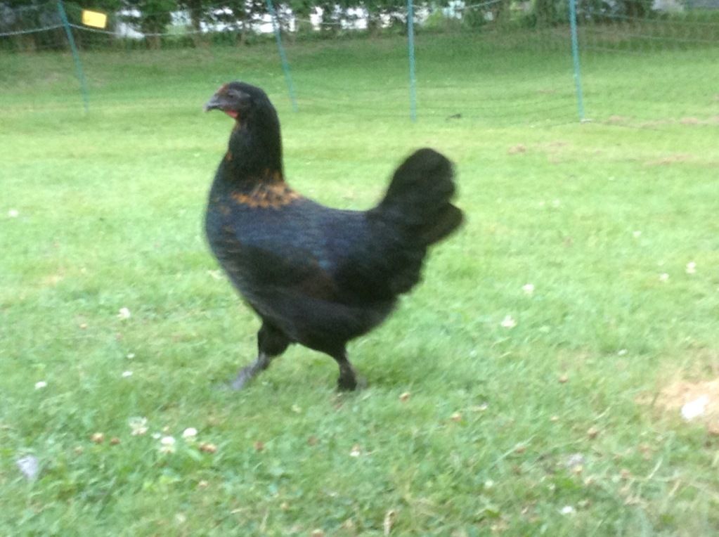 My newest addition, Lucy. BCM mix? Sally8 figures she is about 4 months old. I lover her copper necklace. Very skittish with me but is settling in ok. She finally turned on Stella the BR when she tried to chase her. Edie still tries but isnt always successful. The big girls just ignore her. She is bigger than Sophie who is 13 weeks old. But she has the same kind of tail as her & a little more wattles. I def believe she is a hen since George was def a boy way before this age.