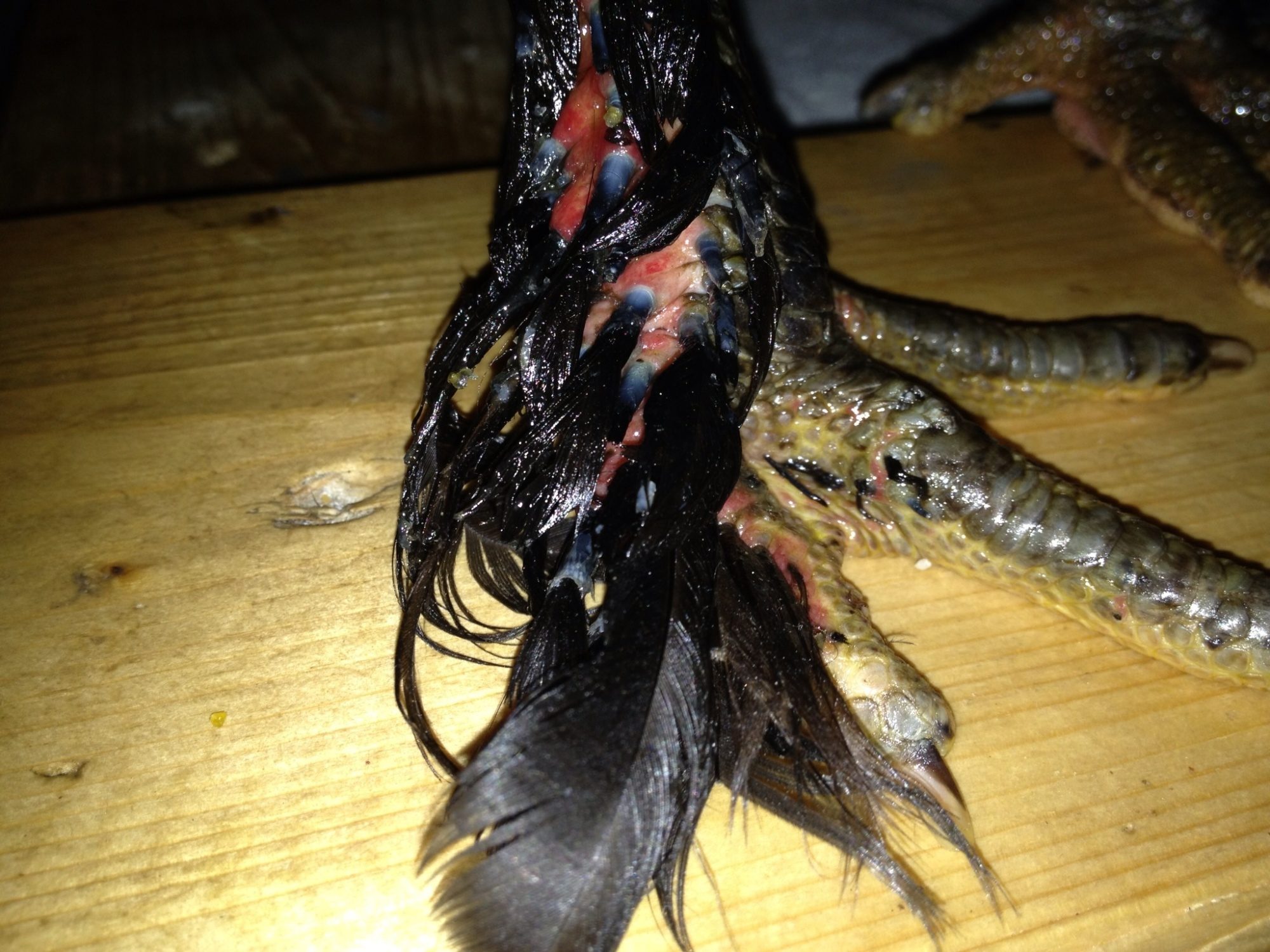 He is eating and drinking normal. His poop seems normal. When he walks, he steps kinda high but my mom thinks its normal for a chickens walk. Other than the leg and foot issue he seems to be much better than when I first caught him. He is growing a bunch of new feathers in now.