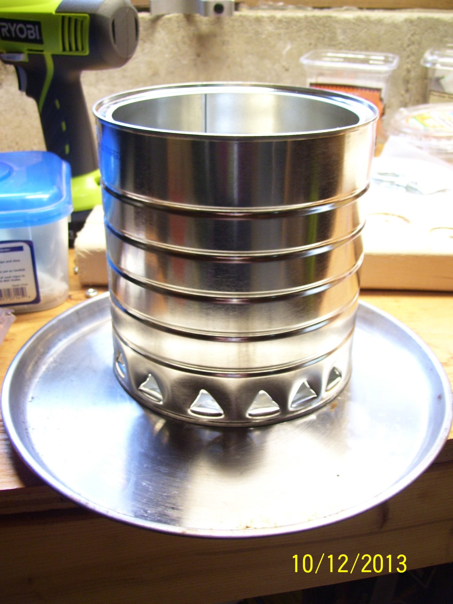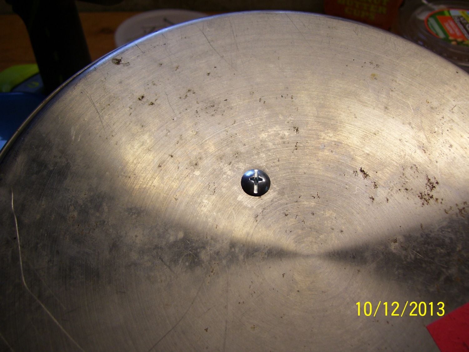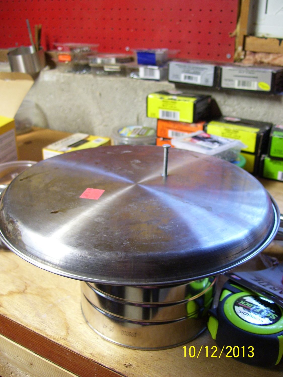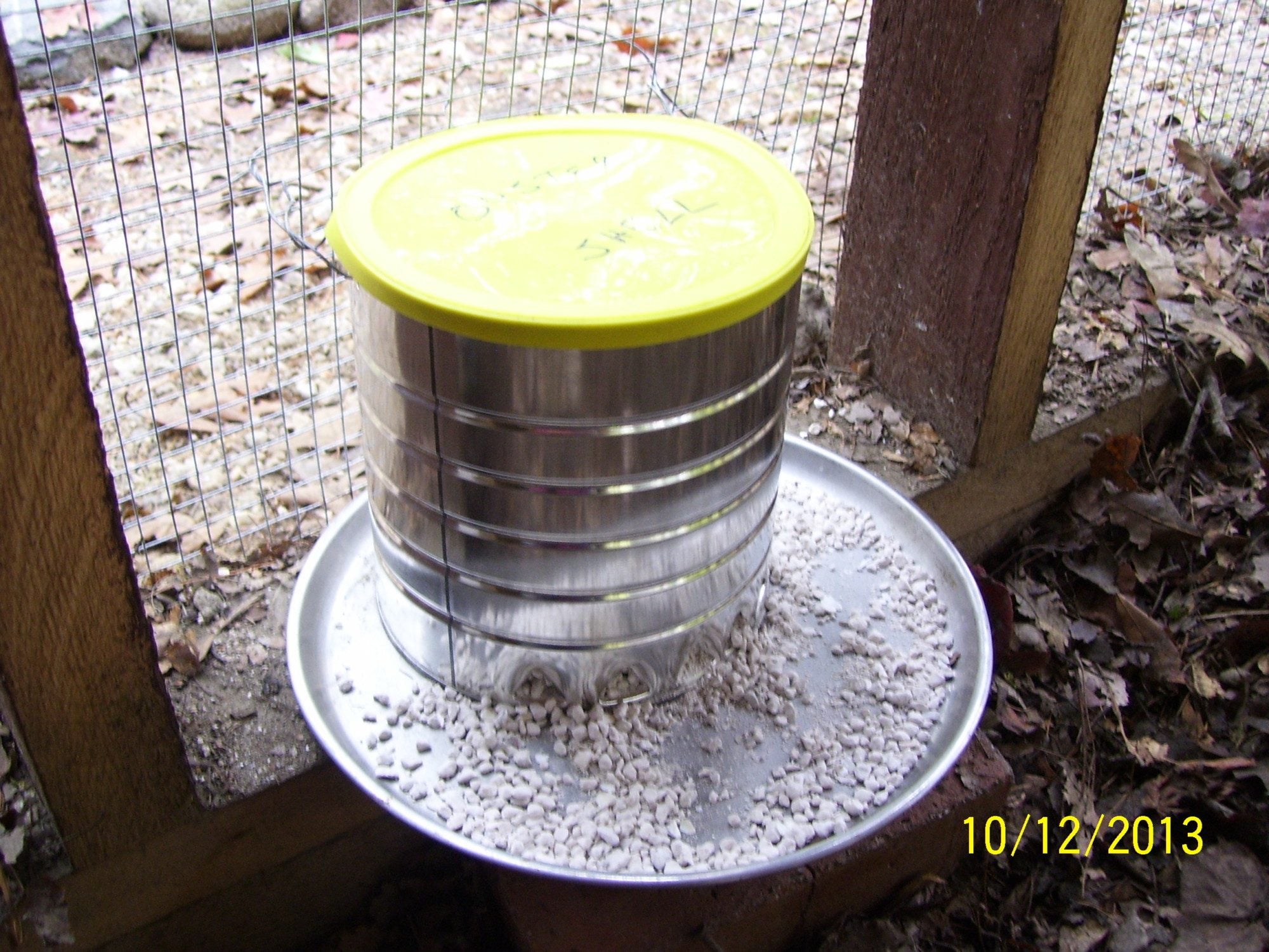 I've been using a plastic quart milk jug to give the "girls" oyster shell. It's very hard to fill--spilled all over the place. I wanted to make an oyster shell feeder out of a coffee can but couldn't figure out how to cut out the "distribution" holes. Then I remembered the little rocket stoves we made in Girl Scouts...we used a punch can opener! So I punched triangles in the bottom, bolted on a small pizza pan I found at Goodwill, and voila!