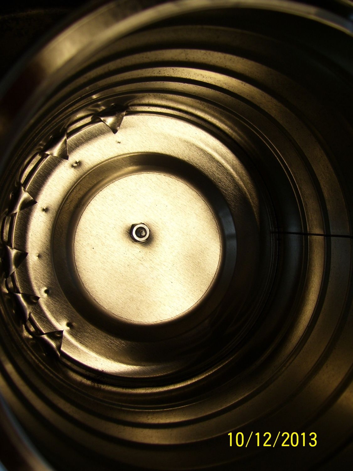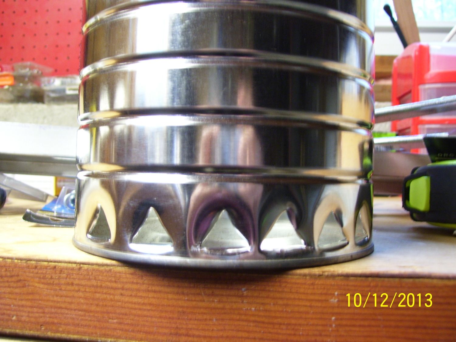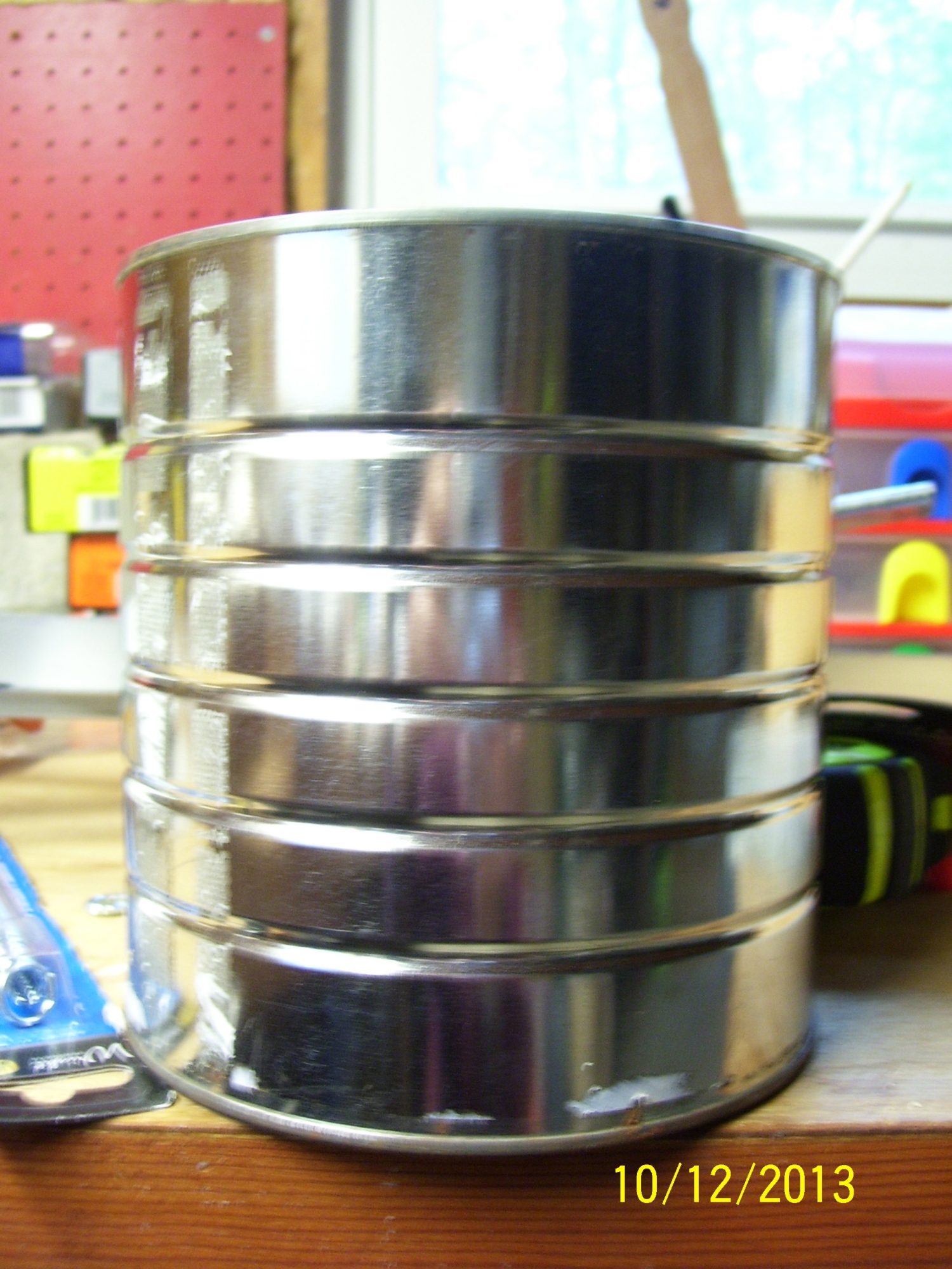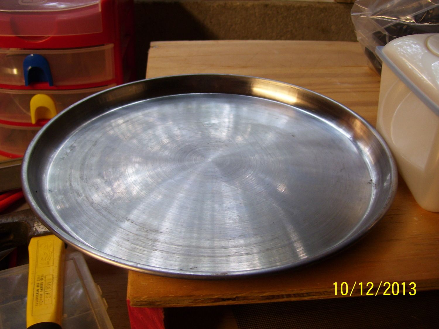 I've been using a plastic quart milk jug to give the "girls" oyster shell. It's very hard to fill--spilled all over the place. I wanted to make an oyster shell feeder out of a coffee can but couldn't figure out how to cut out the "distribution" holes. Then I remembered the little rocket stoves we made in Girl Scouts...we used a punch can opener! So I punched triangles in the bottom, bolted on a small pizza pan I found at Goodwill, and voila!