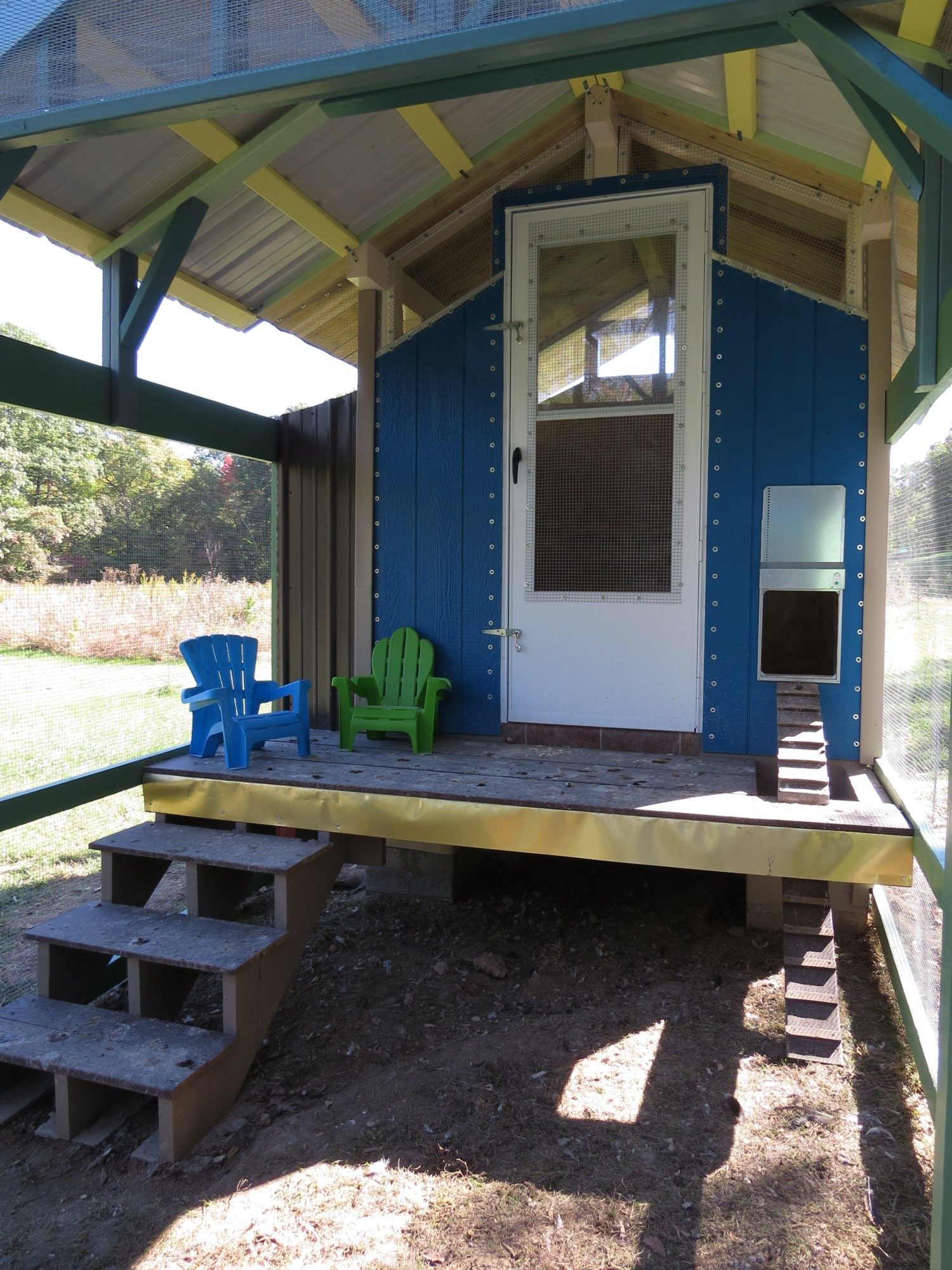 I do have lots of covered space outside, so that's not a problem (see my first pic below). What I don't have is electricity, so no heated bowls for me! But I can put my glass containers on some rigid foam insulation and then the room temp ff and warm water may take longer to freeze.I keep both food and water outside. I do use big plastic heated dog bowls...keeps spilled food and excess humidity out of the coop. My coop is an old construction trailer, so I can put both water and food under it, it is about 3/5 feet off the ground.