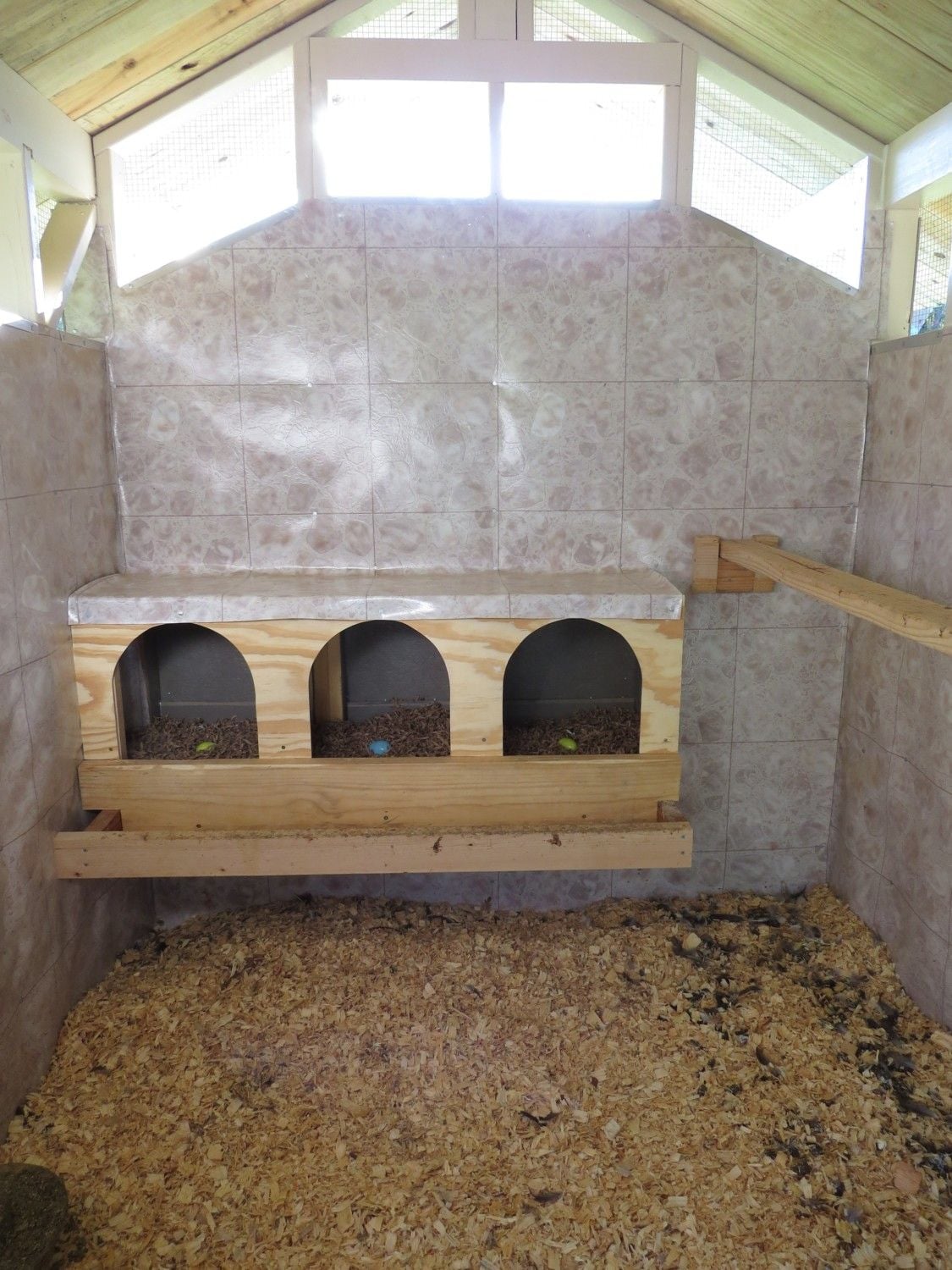 The next picture shows the inside of the coop. The only windows still open are the slanted one on the left and the two triangles at the top (plus their twins in the front wall that you saw in the last picture). I covered up both side walls completely, but it still seemed too drafty on them on the roost, so I covered up the right slanted window, and both rectangular ones. I could pretty easily open up the left rectangular one, though, if you think it would be a good idea.