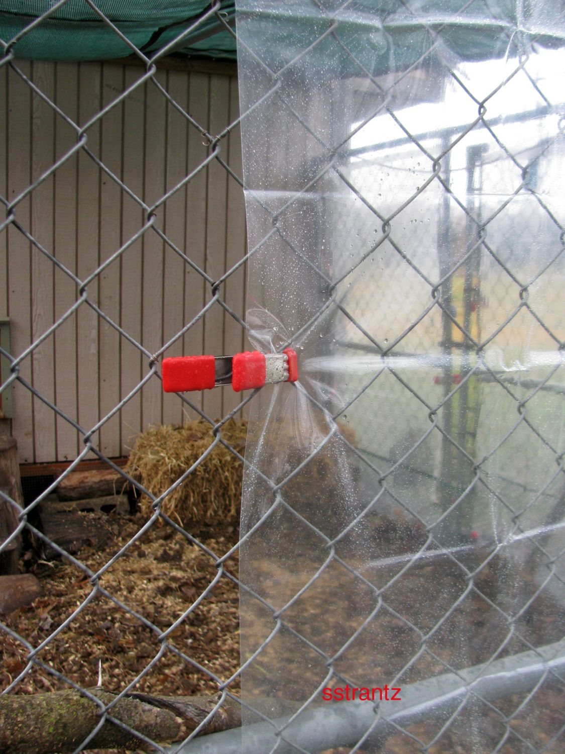 Awhile back I said I'd post a photo of the shower curtain "tarps" I put up. I wanted to make a wind break for the winter but wanted them to be able to see outside (and me in) so they would be aware of predators. I looked at "clear" tarps but none of them were clear and definitely kept you from seeing through.