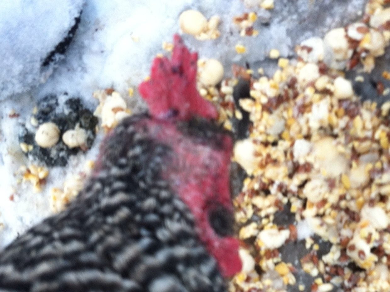 Ok as you look at the pics your looking at the back of her head as her beak is at the ground eating. See the comb? Look to the left you can see a little of her black & white feathers than it's all red skin to her eyes. It's like that in the right as well.