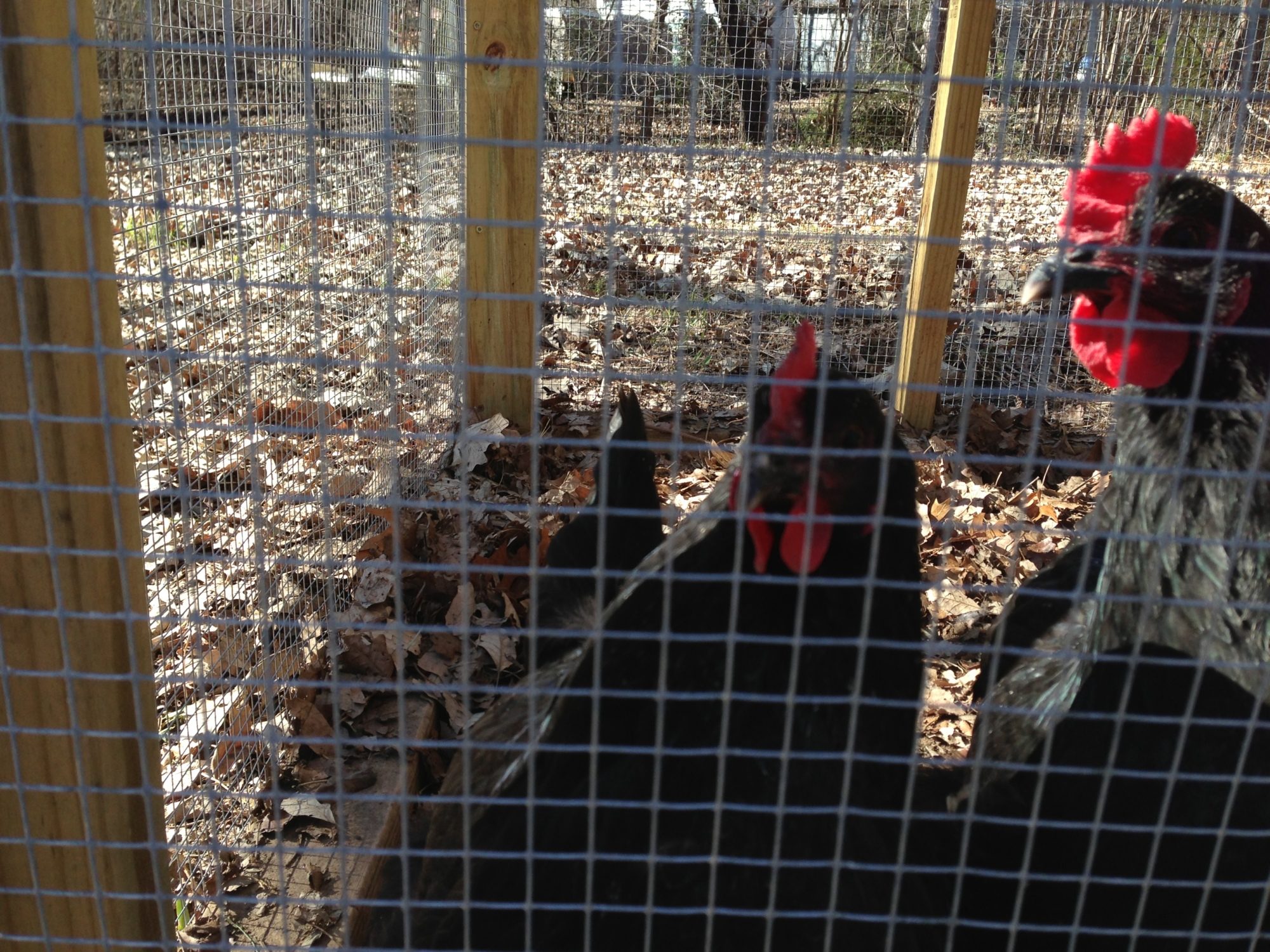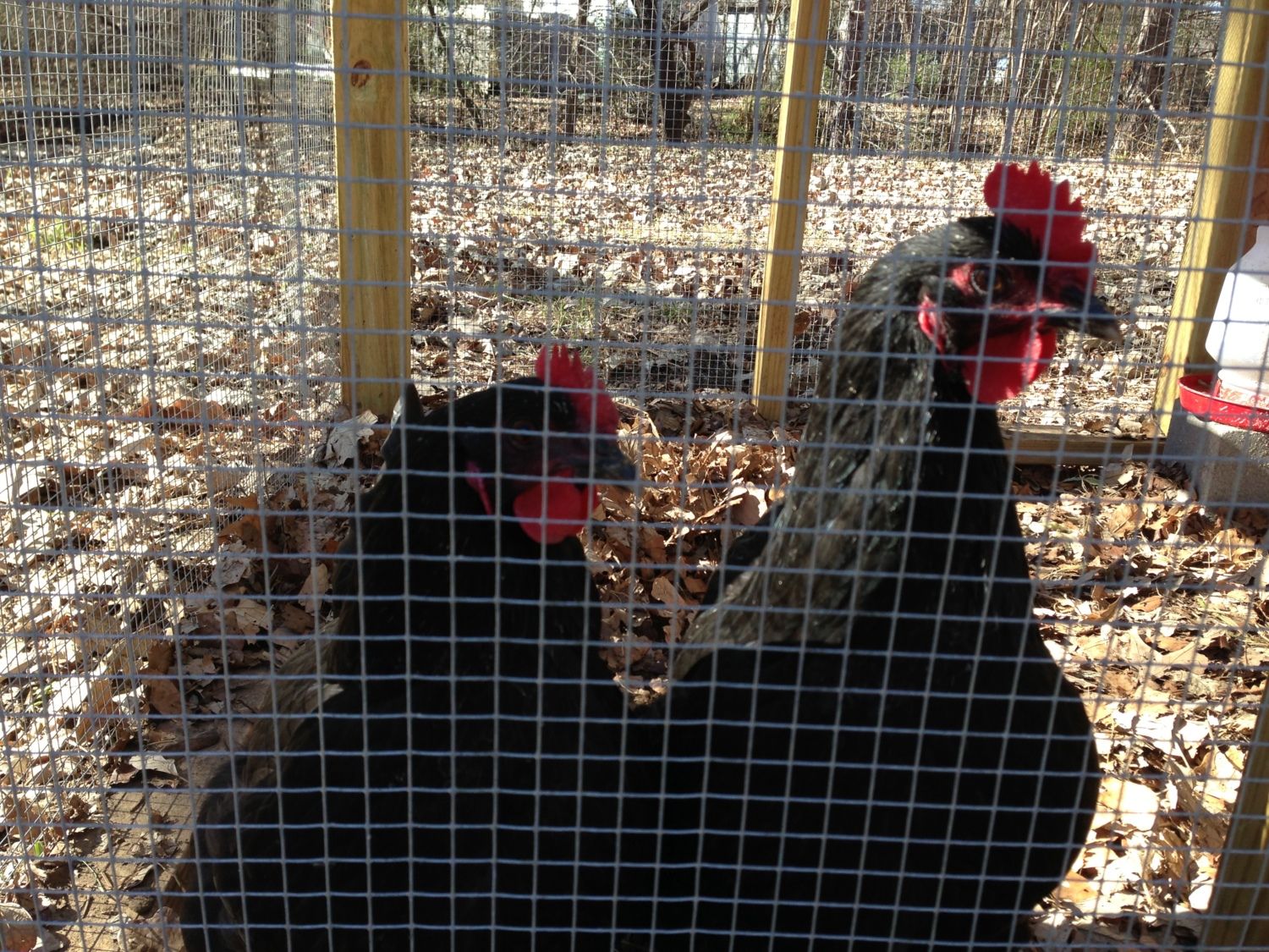 The girl on the right is squatting for me. Yesterday, when she squatted, I pet her back. She did the shuffle of her feathers after that. I was so surprised! The one on the left is Blackie. She's always been smaller and has never grown her wattles or comb as large. These are both hatchery birds and they have ff all over them.
