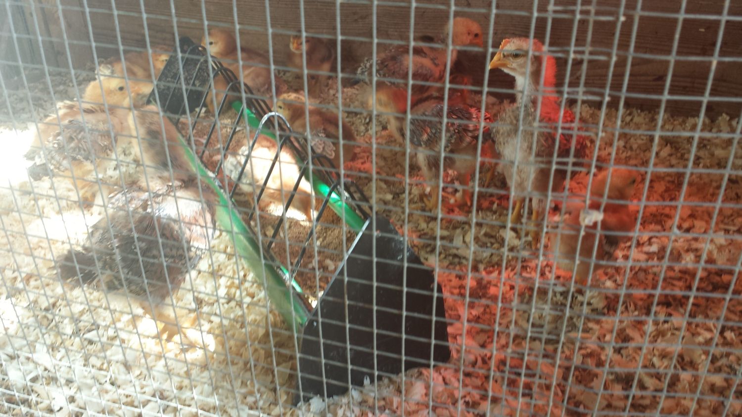 Quote: I have both sizes and really like them for ff because they don't waste any and can not step in it. Keep in mind these are all chicks under 3 weeks so adults are much bigger relative to the size of this feeder. The one in the pic is the small size. I never thought about using them for water but it would work well to prevent stepping in it but. .. Not for keeping wattles out if you are worried about frost bite