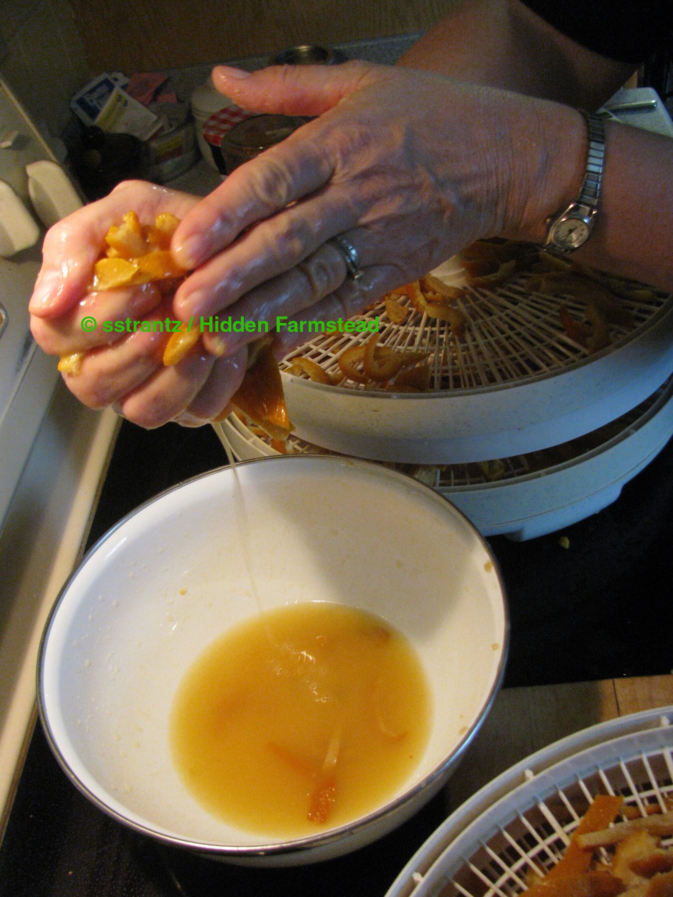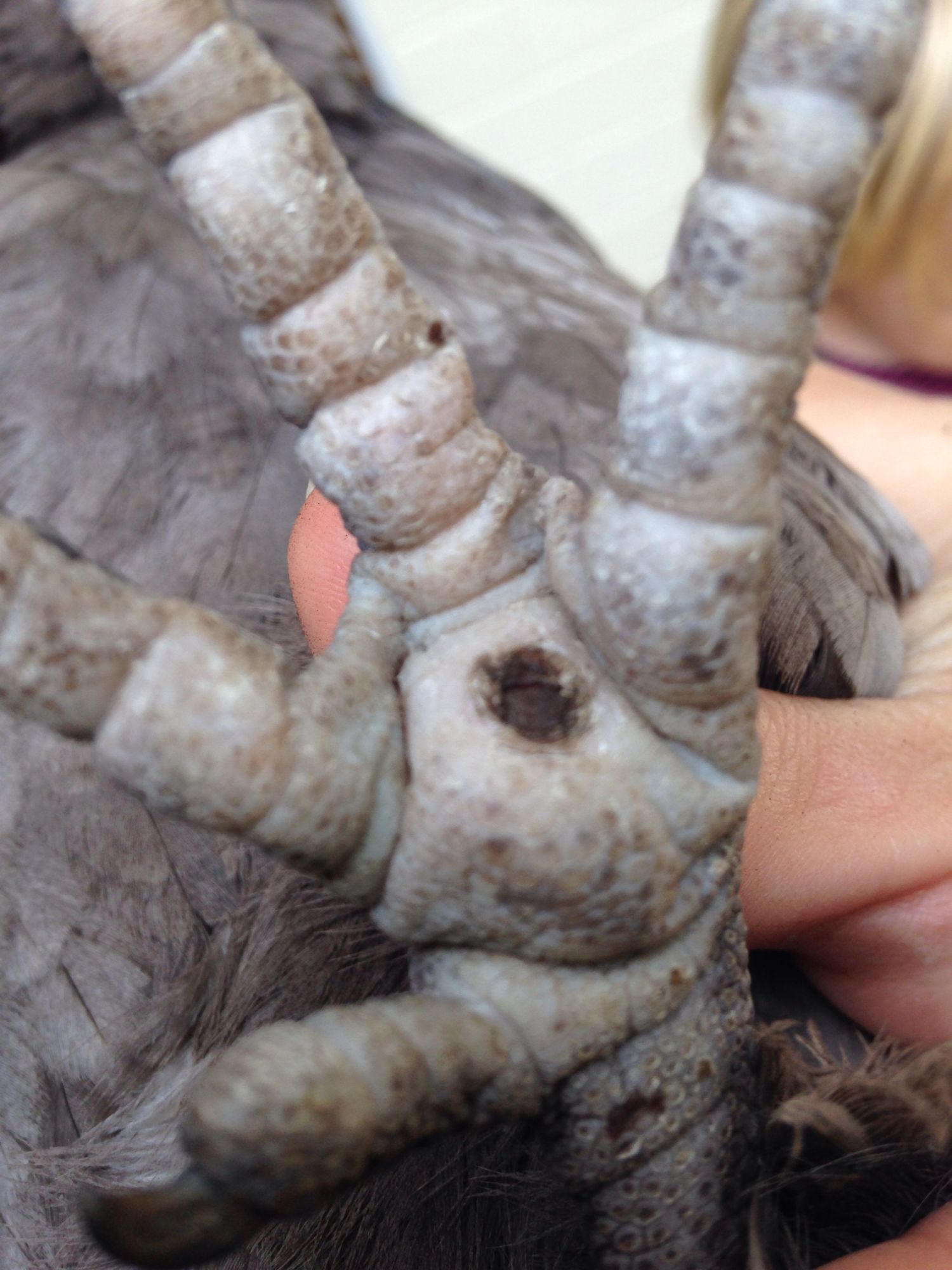 she began to act like she wasn't feeling well. She would do the classic "hunker down and fluff up" thing. Just prior to that we saw blood drops on the roost bar that is in front of the nest boxes which prompted me to look at each bird individually. I think the blood was actually from a comb, but when I looked at them I saw the scab on one foot and a bruise-like appearance on the other on this girl. I had noticed a day prior that she had started "hunkering down" so I began to work on her feet.