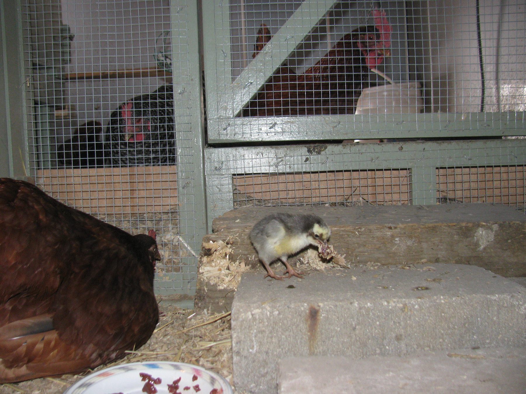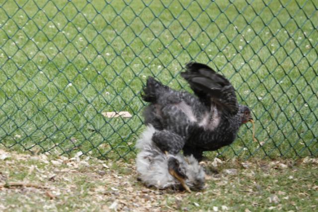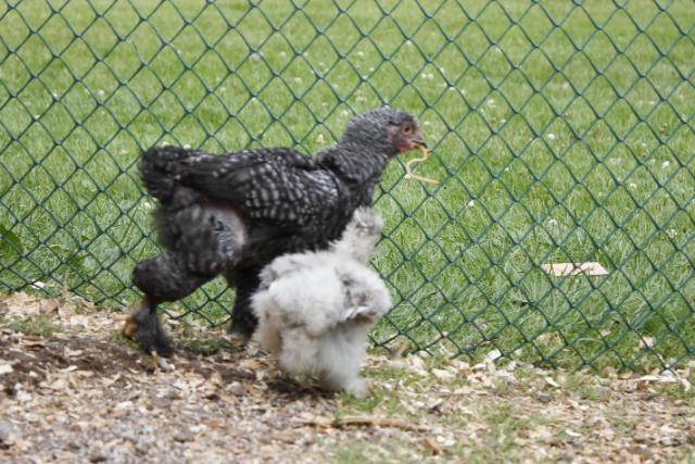 Anyway, with the little ones and no mom, I'd cut them into very small pieces and let them try them. Or...you could just cheat like I do and thaw out some ground meat and just give them tiny pieces. It doesn't take long until they'll start playing "keep away" like the adults do! Chick football! After they start that, they'll tear those worms apart all by themselves!