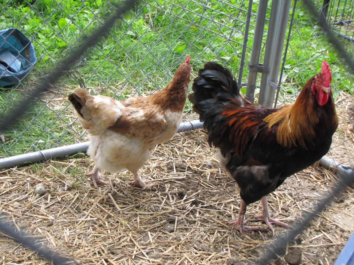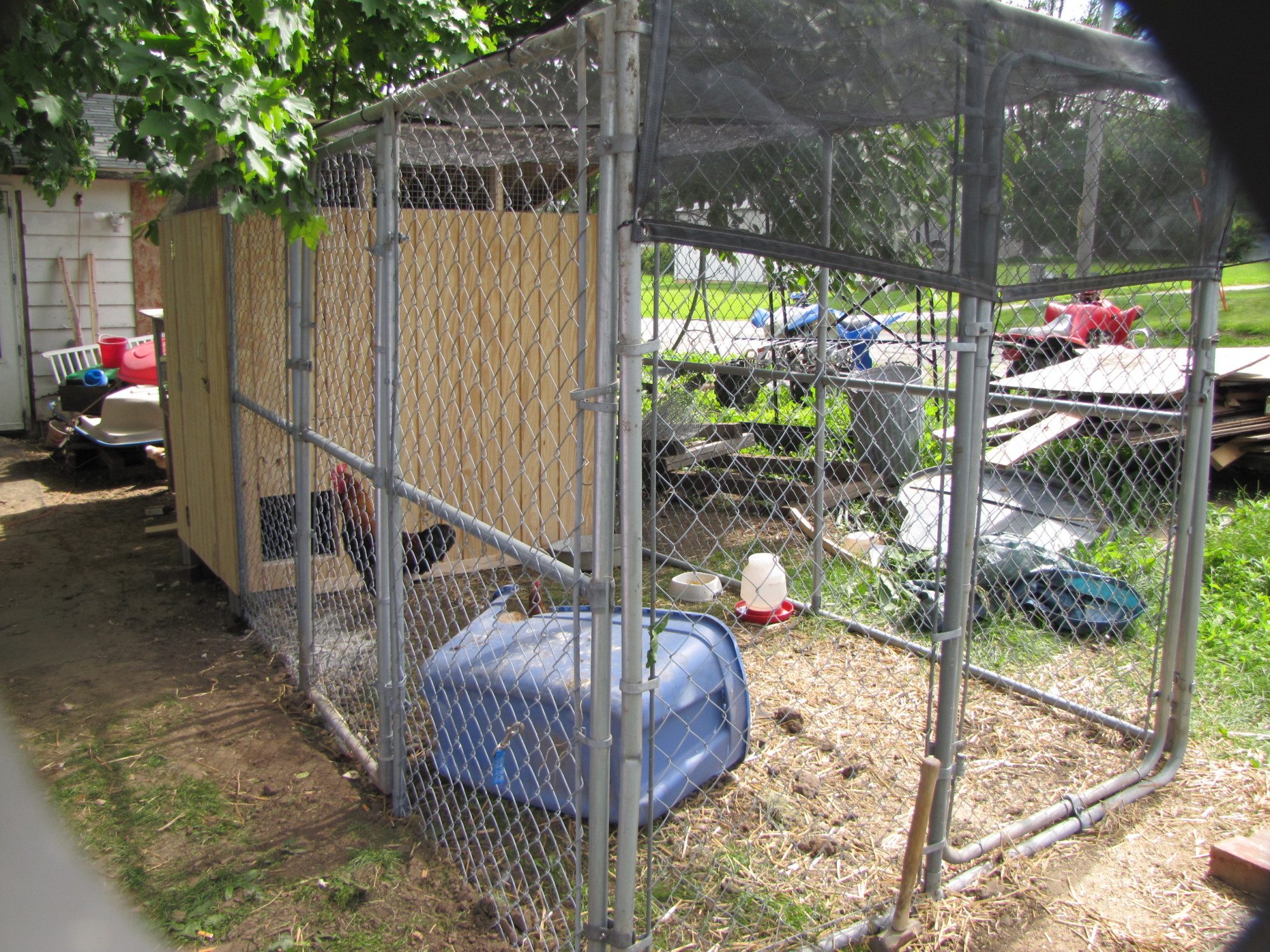 an old crib as a fence, my large coop with the door no quit shut (lol), a rabbit cage, another small coop and run, and raised duck pen all fenced so everyone takes turns getting time out...even the bunnies all under a nice shade tree..
