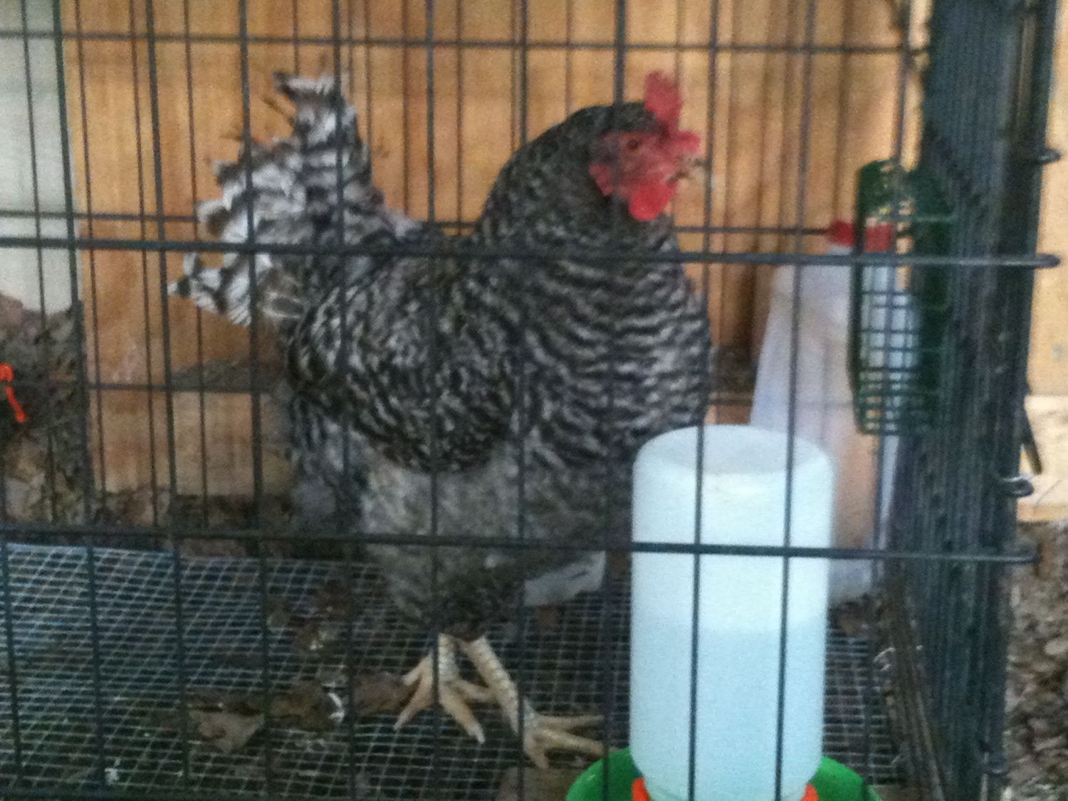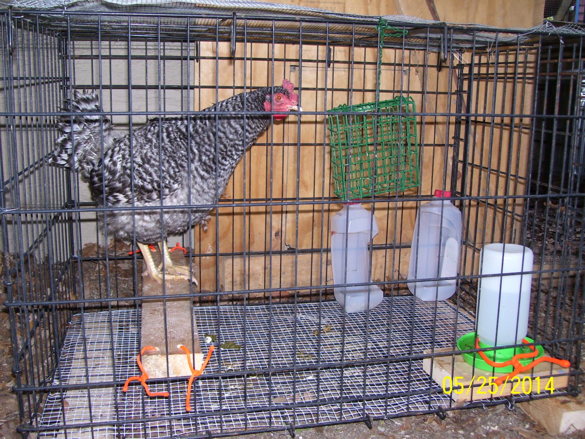 I used a dog crate turned upside down, so there would not be a "floor." I lined the bottom with 1/2-inch hardware cloth, because the wires were spaced too far apart for her feet and put a roost bar in it. Since I have hatchery birds (both Barred Rocks who tried out the broody thing) it only took 2 days in the "breaker." I didn't dunk either of them, just picked them off the nest & put them in the cage with food & water. It was in the run part and up on pieces of 2x4 because I could not hang it. I put the crate's floor on top to keep her "sisters" from pooping on her.well that cornish got over her thing i guess she figured everyone else was up there being broody she would try for a few hours..thank god what are the tricks for breaking a broody just in case i don't need a 15 lb chicken getting an attitude when there is no eggs for her...