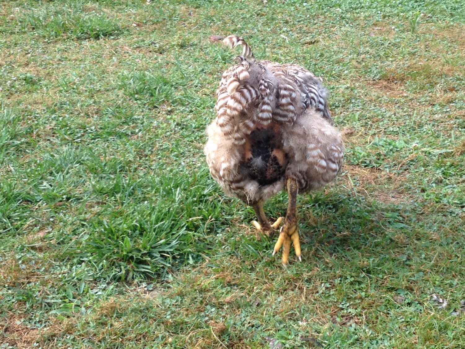 @Leahs Mom I sort of got a pic of Stella the other day. Well a rear view but you can see what I mean about her feathers. The black on her bum is new feathers coming in. It's now totally black. Her neck and top of head where feathers were picked off last spring have finally grew back in also. I'm hoping after her molt she starts laying normally again.