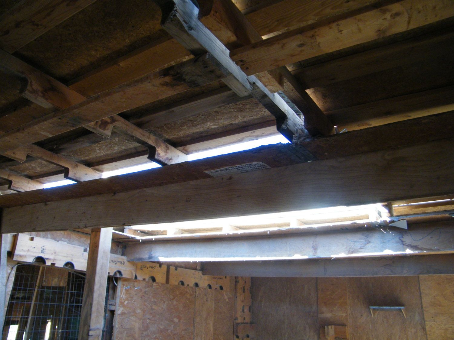 Plywood pieces removed. On the left side of the photo you can see the strips of plywood secured over the seams to prevent water from getting in. It didn't work. Every time it rains here, the inside of the barn gets wet enough... too wet!