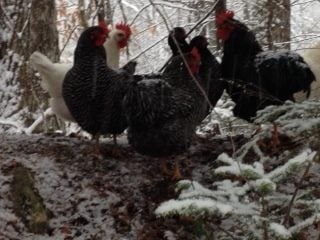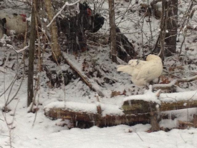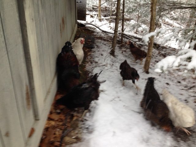 So this could get interesting. I let the flock out to putter this morning, and of course it started to snow.