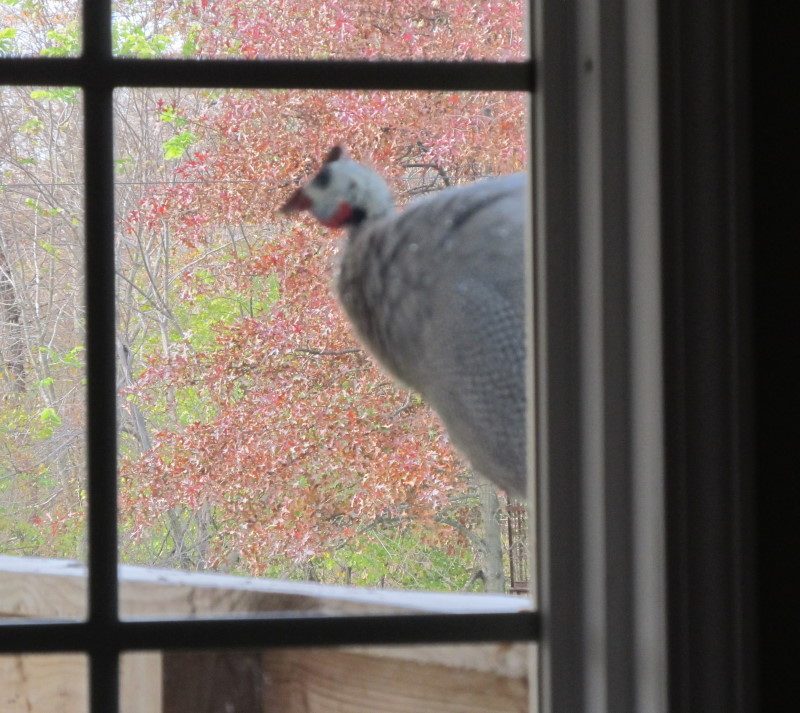 Aw he's cute......my hubby says guineas are too loudThis is Bam-Bam a guinea, he visits his reflection to peck at it every day on my front window while standing on the deck railing. Yes there is fertilizer I have to sweep off the deck and railing but I would miss him if he didn't greet me every day =). In the summer is when all the hens come to sit on the porch ramp to warm in the sun. I noticed they haven't done it so far this winter. The "fertilizer" is a little more difficult in the summer I do have to scrub it off then. hehe.