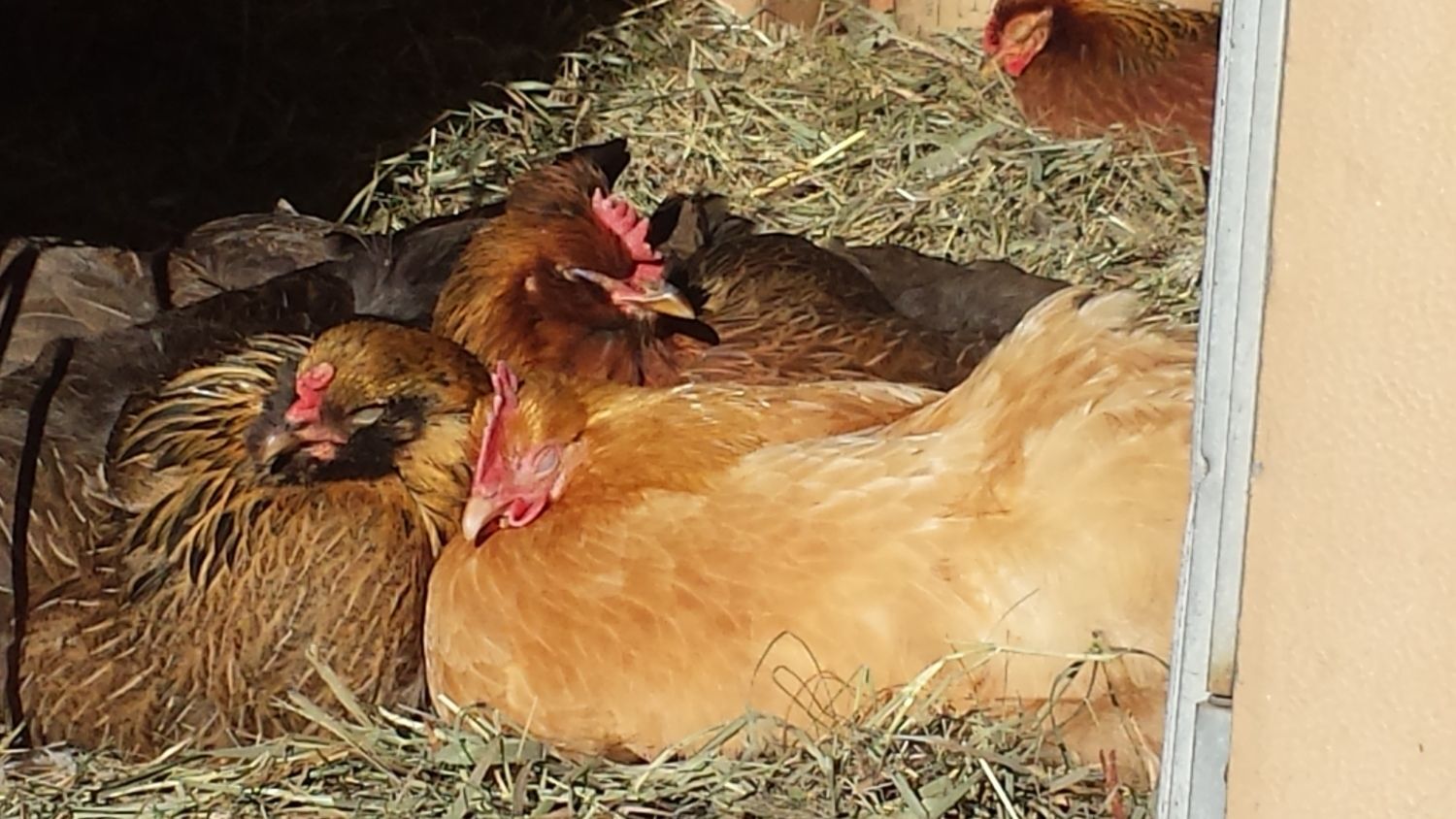 Its a January thaw, 35F and sunny! lucky me, due to a fluke I'm home from work today. Did a little coop cleaning - put fresh hay down. Found a nest of 8 eggs, looks like two more pullets have been laying in it. Wonder who? Flock was busy scratching in the hay under the trailer and in the sun porch - had 6 chickens crowded in there, tons of dustbathing going on everywhere....opened the coop door to let the sun in and it didn't take long: The front two are hatchery girls from the family that didn't want to keep their chicks this winter. The middle one is a mutt hatch from my broody last spring, and so is the one in the back. All sleeping in the sun.