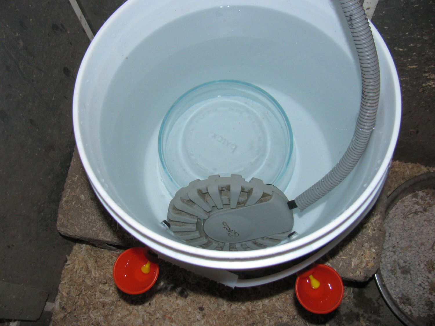 Also - since the springs in the mechanisms were freezing when the temps get into the teens, I changed the way I put the bird bath heater in the bucket. I still keep the pyrex inside the bucket (turned upside down in this photo), but use it to push the heater right up behind the intakes so it's right up against the mechanism. We'll see if that helps! Here's a photo: