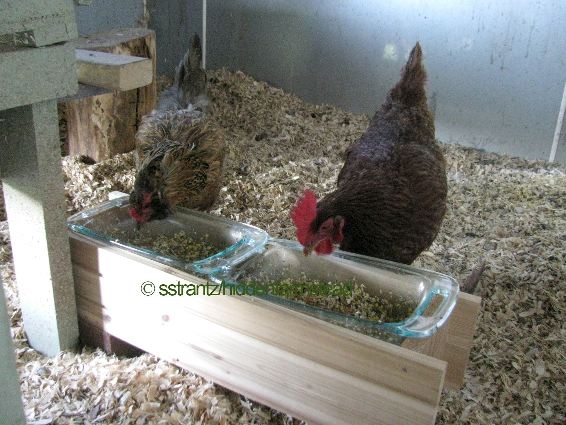 I found some pyrex bread pans at resale shops and a wooden planter box that they fit in perfectly. The planter keeps them from being tipped over. Could just fill the planter with dry feed itself if you have one that's not treated lumber. I originally got the pyrex pans for wet feed which I don't put on wood. Any deep trough-type thing will work if it's sufficiently heavy for them not to tip it over.