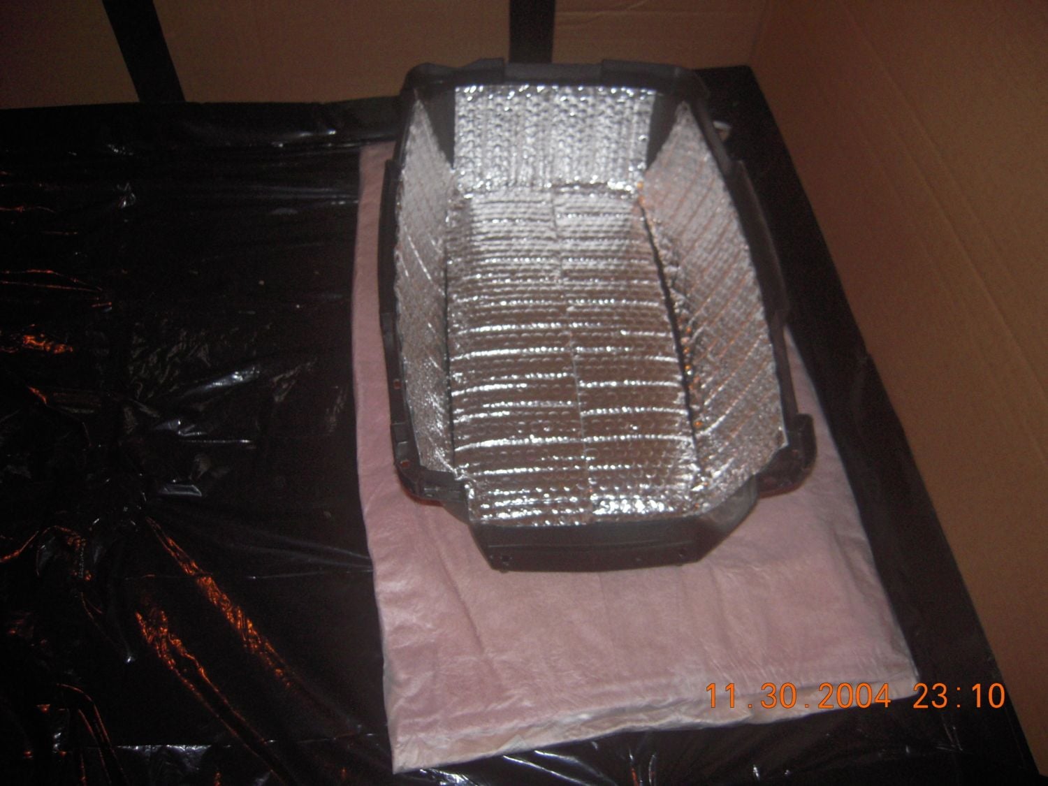 Here's the inside of the pet carrier. It's lined with bubble foil insulation. It comes with a partial sticky side. The heating pad is on the bottom, wrapped in aluminum foil, then old towels, then Press and Seal.