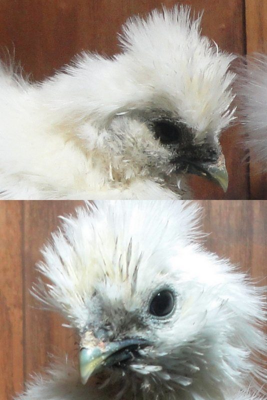 Mr. Wiggin. Staring the camera down. All three boy looking Silkies have a wider space where the comb will evenually grow in. Five week old chicks.