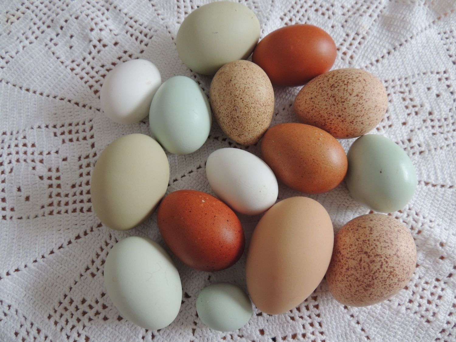 Stony, I loved your article. Very informative. I have 4 broodies right now in nests about 18-24 in off the coop floor and now I'll leave them. When the pullets first started laying some dropped the egg down to the floor from the roost. With so much bedding (litter) it must have bounced because it didn't break. Can you help again with ways to break a broody hen? Mama hatches 4 times a year? That thought causes me to break out in hives. I shouldn't have hatched so many and let nature take place. I'll be standing out in the road saying, "Congratulations, you're the 10th person to drive by since 5pm. Here, have a chick, 25th person, here have a chick." lol Eggs I collected last week. I got one smaller than a marble. So cute! Even turkey eggs look pretty.