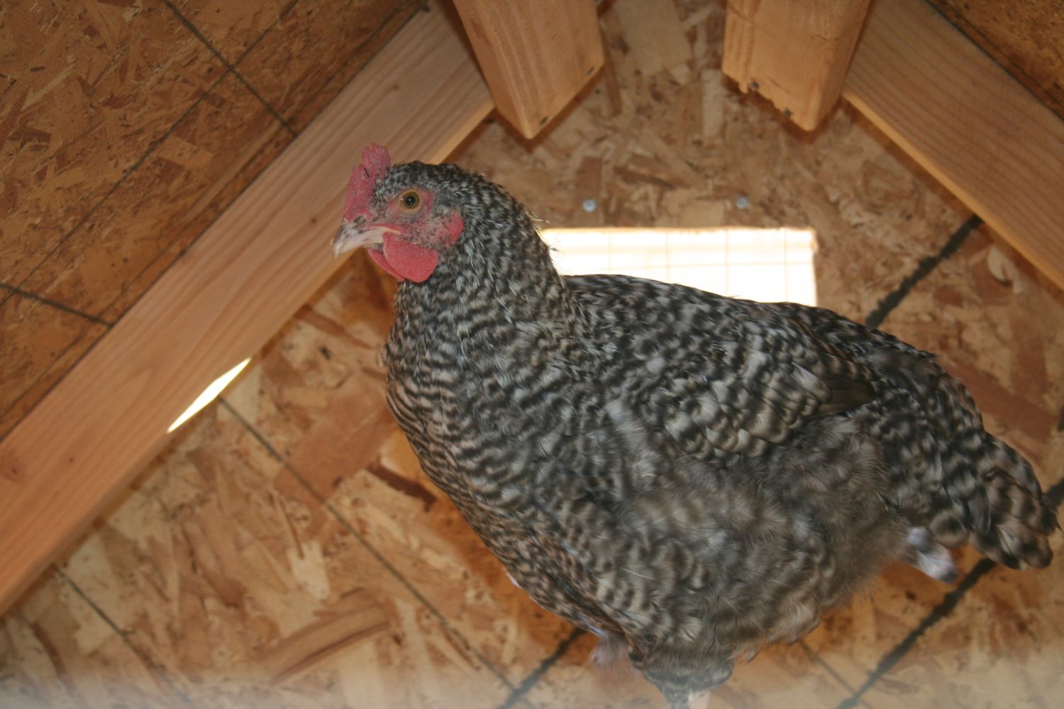 Stella, Cuckoo Marans (on the roost in the coop)
