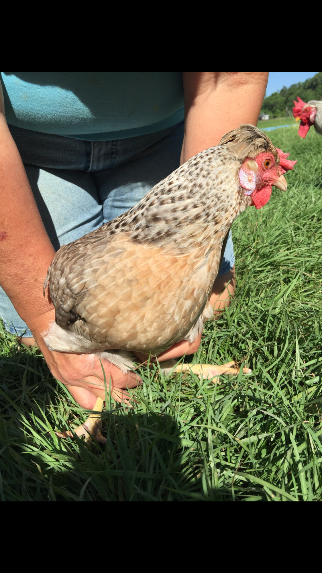 About the flock- Our birds are the Jill Rees line, bought directly from GFF last year. No middle man. We bred to keep with the Standard of Perfection. We culled 14 Roos and only kept the best 3 for breeding. The Roos all have upright combs with 6 well defined peaks. They also have the double cream gene with no chestnut coloring. Our hens are mostly the light color throughout and have true cream hackles. Everyone has crests. I've noticed that this line produces lighter birds and smoother crests. At the beginning of heir laying cycle, the eggs are a spearmint blue but do progress to a powder blue.