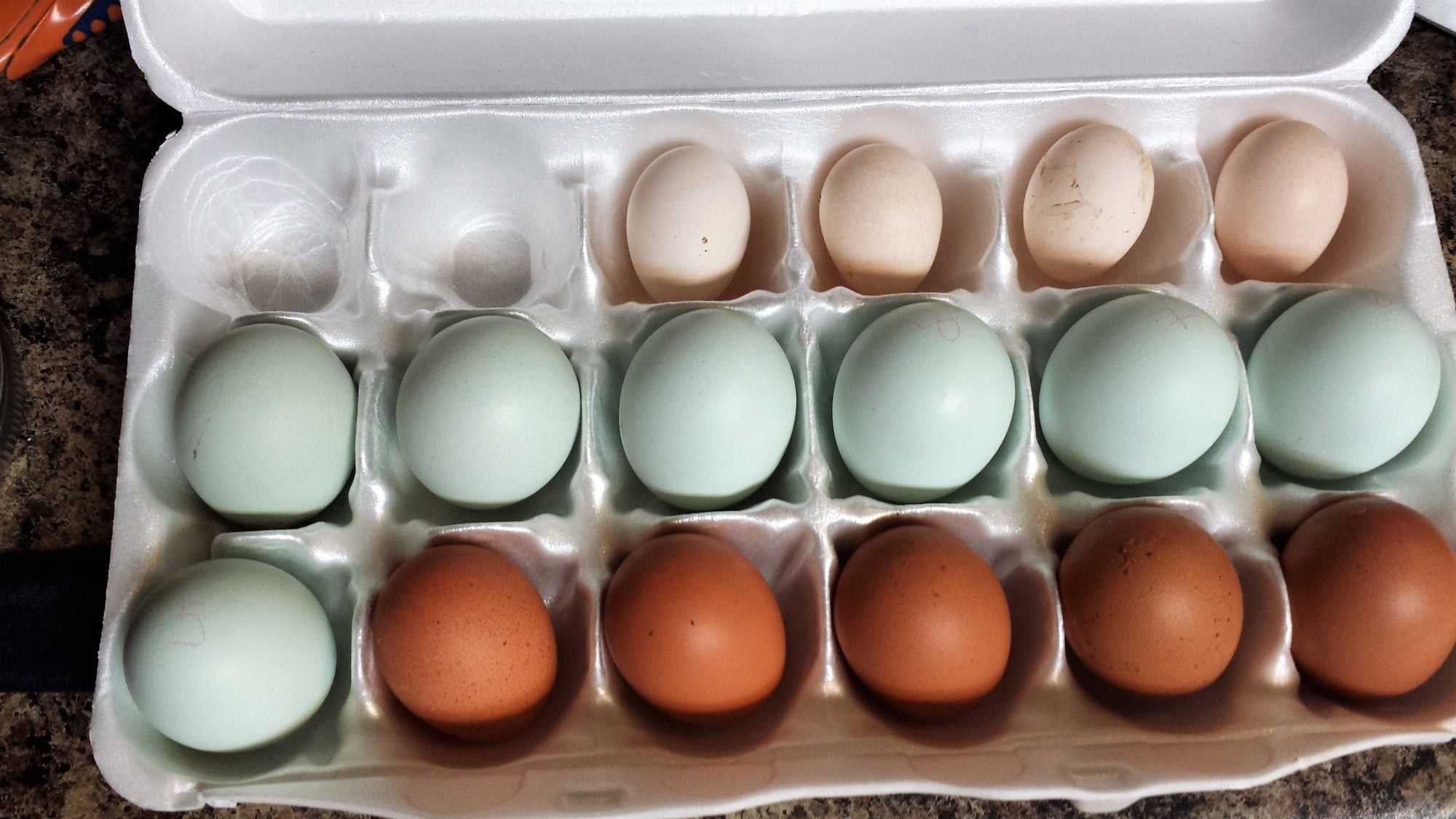 It has been raining this week quite a bit so eggs are not spotless but are still pretty clean. Eggs are from 2/16, 2/17, 2/18, 2/19 plus whatever they lay tomorrow.
