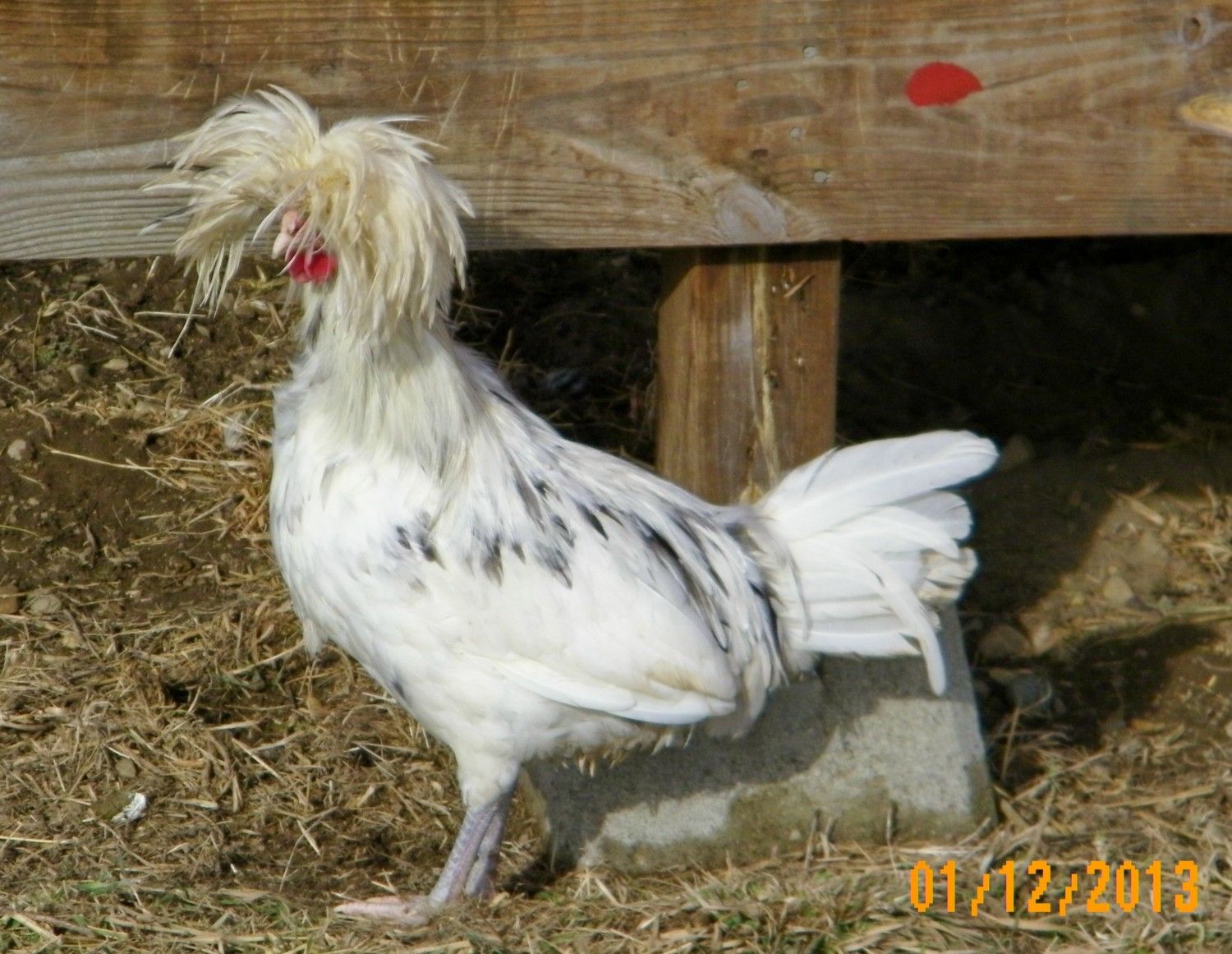 We have a Splash Polish Roo over a Splash Polish hen, Crele Polish Hen, White Crested Buff Polish hen and a White Crested Blue Polish FRIZZLED Bantam hen.