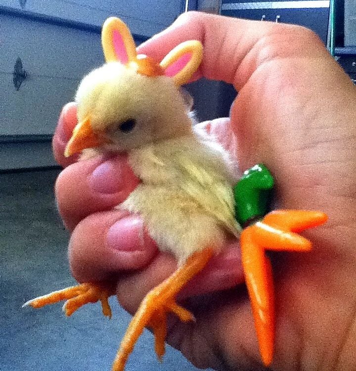 well.................:gig that's a good question! back when Cadbury hatched; that's him in the picture as a chick; I named him Cadbury because he reminded me of my favorite eacter candy.....so I took my sister's old LPS collection I have no idea why she had, and I dressed Cadbury up as a bunny:gig he is now a GROWN MAN and he likes to stay that way:lau that picture was taken all the way back in may I think.....