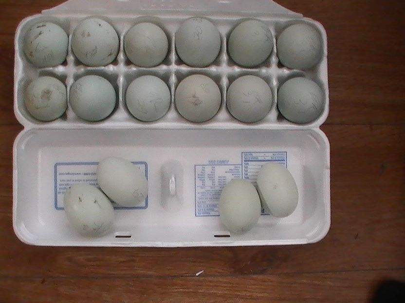 The porcelains are a starter pen. "m just getting going. There is one hen that produces mostly blue cream and a pullet that has been producing black. I haven't figured out which pullet it is, or rather which are her eggs. I have 3 sizzle pens and all are laying 1 to 2 eggs a day. My paint pen is also a beginner pen. I just purchased a very nice black roo and the 2 hens laying are white with the black spots. There is a pullet in there that is mostly white. She came from the same parents as the 2 hens but she isn't old enough to lay yet. Two of the sizzle pens are mixed color. One pen is white. I only use 1 parent a frizzle and other parent is silkie to avoid the double frizzle gene.