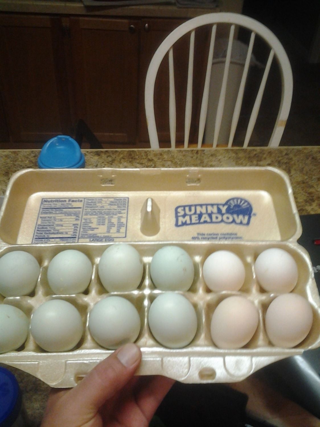 The 8 blue eggs on the far left will hatch "Ice Cream Bars" or F1 straight comb Olive Eggers.