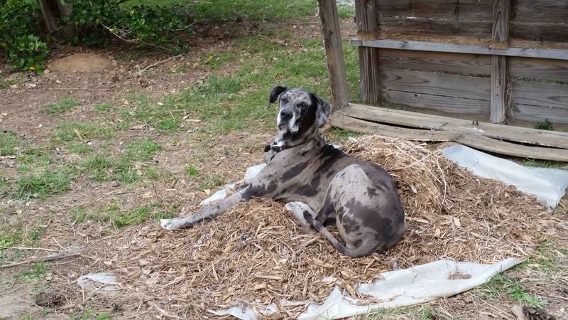 Our helper, Abby the great dane - she was never far from us any time we were working on the new pen. The doberman stayed inside and pouted because working on the pen cut in on his walks