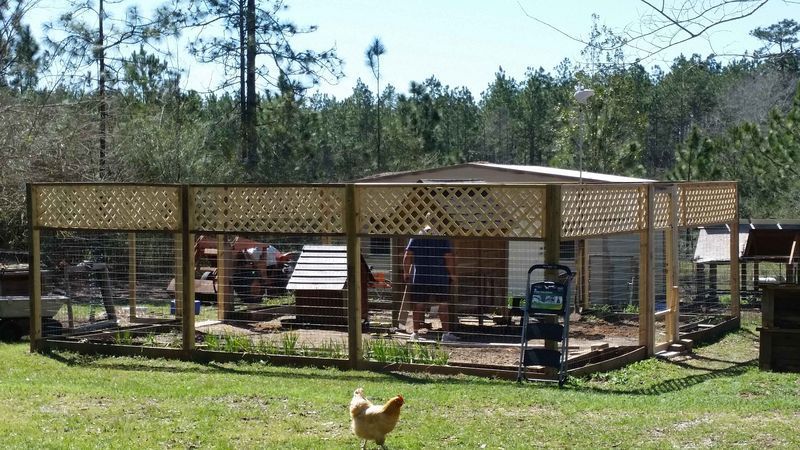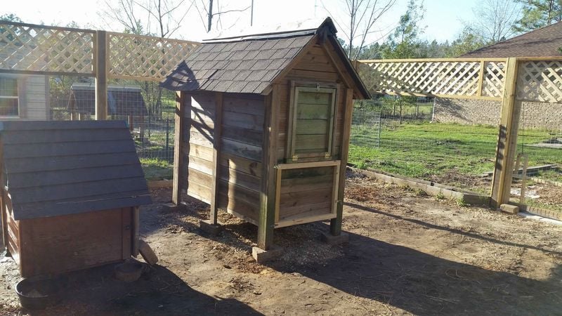 We started with the duck hut (the one closer to the ground), then built the chicken hut when I added chickens. They were in front of a bunch of pines and scrub brush. We then had to put a pen around the huts as a family of foxes seems to use our birds to train their new kids how to hunt. Last summer, we had a bunch of pines removed and in the process, the scrub brush was removed too. This left the huts and pen wide open and it just didn't look very nice.