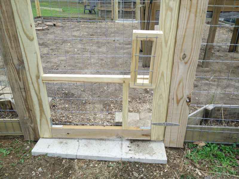 You can see in the people gate there is a duck/chicken door - lets them in and out, but keeps Abby out preventing her from eating their food and making a mess in the yard after...)
